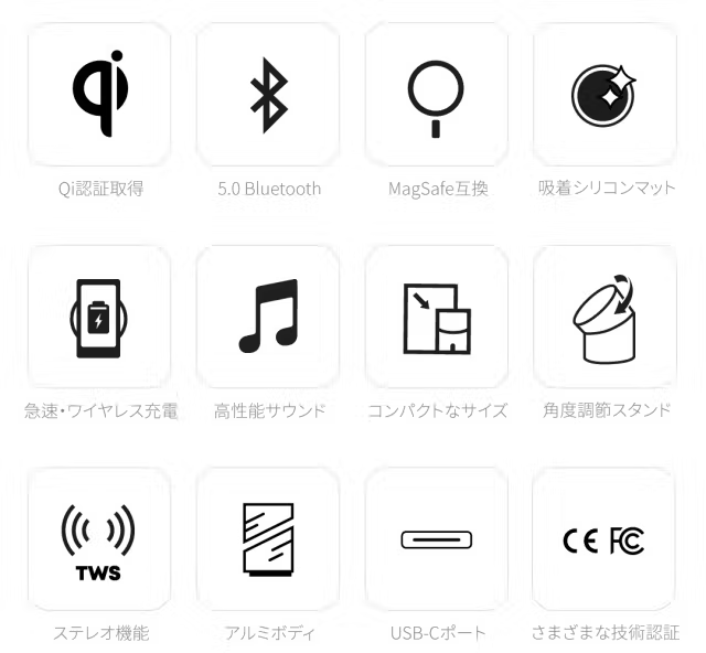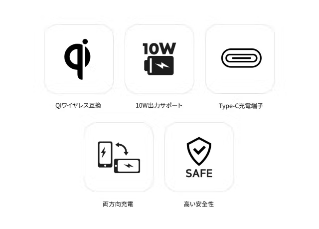ワイヤレスパワーコンソーシアム (WPC/Wireless Power Consortium) が認定した国際ワイヤレス標準規格ブランドです。WPCは、各種先端技術分野のリーディングカンパニーを含めた200以上の会員企業で構成されており、400種以上のさまざまなワイヤレス充電製品を認証している実力と信頼性が認められている協会です。「Qi認証」は、全世界標準化ロゴであり、「Qiロゴ」がある場所であれば、どの場所でも製品を充電器や配線、アダプタなしでワイヤレスで充電できます。
