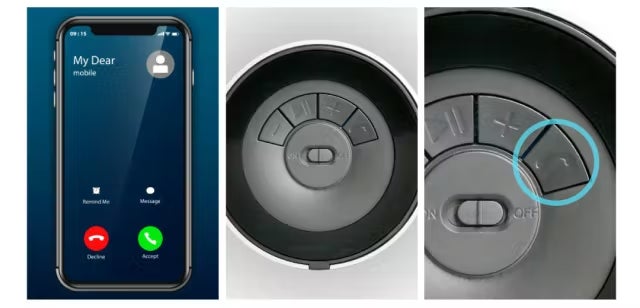 ※スマートフォン通話ボタンで電話を受ける場合、スマートフォン画面から音声出力機器をスピーカーに選択してください。スムーズな通話のためのスピーカーとの距離は最大2m程度です。