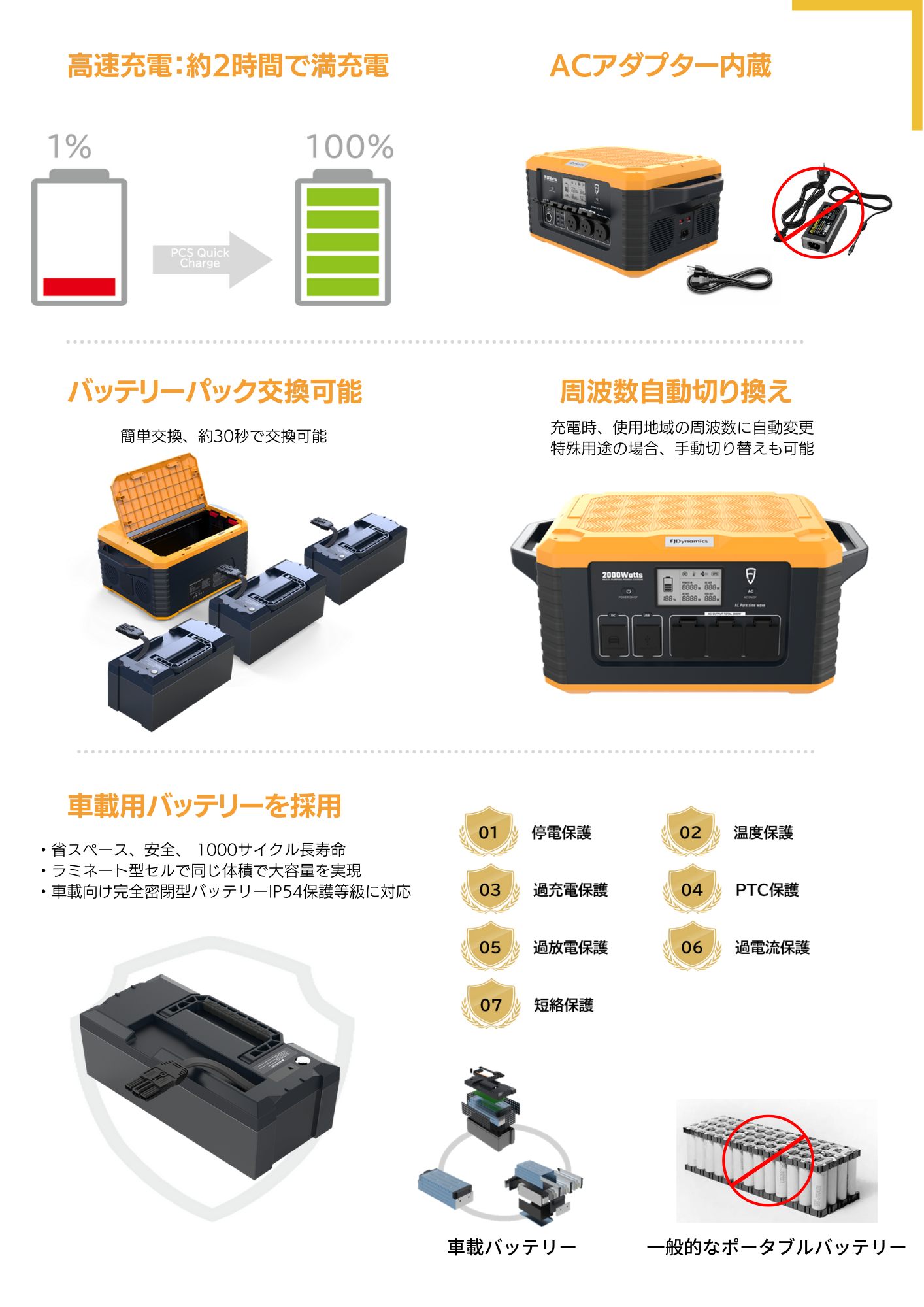 周波数変換は? ⇒ 50Hz ↔ 60Hz周波数変換(コンセントの周波数に自己適応するので、コンセントに差し込むだけで自動変換。)
