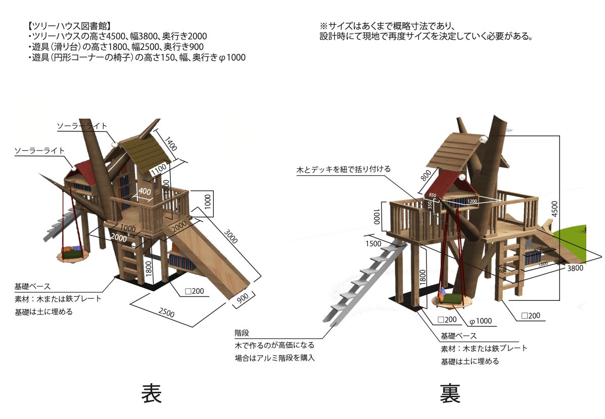ツリーハウスの下には公園を作り、子供たちが遊ぶ様子を見守りながら、木の上やブランコで読書が出来るような環境づくりが目標です。