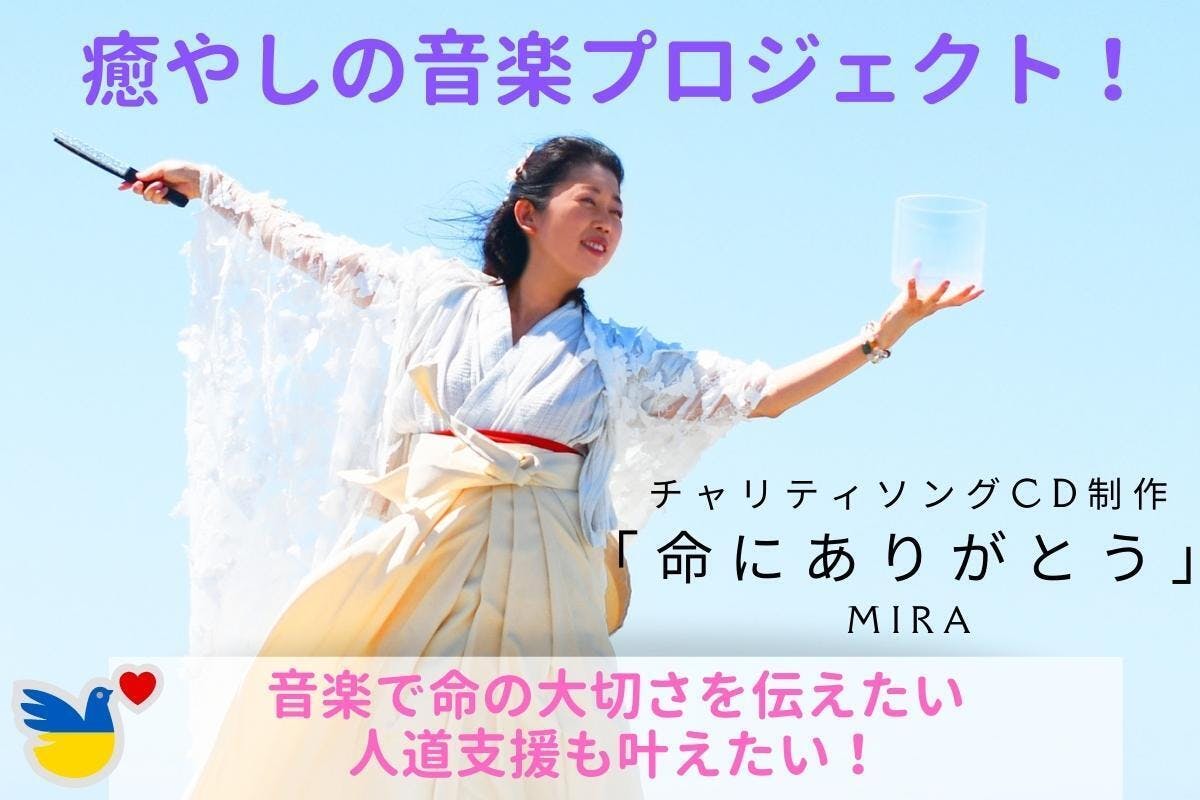 2022/10/03 12:00ご支援者の皆様へこんにちは!皆様、お元気にお過ごしでしょうか。新たな再挑戦をさせて頂きたく、そして、ご支援者の皆様に応援をお願いしたく活動報告にてご連絡をさせて頂きました。そして、今年2月には、『世界を幸せに!「マントラ」CD制作プロジェクト(般若心経J-ポップ×528HZ)』のクラウドファンディングでは、たくさんの応援を下さり、本当にありがとうございました!心から再び御礼を申し上げます。とても感謝をいたしております。<前回応援下さった曲「般若心経J-ポップ」>応援下さった皆様のおかげで、クラウドファンディング終了後、まるで光のようい一瞬にてメロディと言葉が降りて生まれた曲がございます。それは、「命にありがとう」という曲です。(ご支援者の皆様への感謝の気持ちを込めて昨年の3月27日にオンラインでのライブ配信の最後に歌わせて頂きました曲です。)「命にありがとう」の曲は命の大切さやすべての生命の幸せを願う気持ち、そして、「命への尊重と感謝」の気持が純粋に込められた曲です。<今回の新しいクラウドファンディングに挑戦のプロジェクト曲「命にありがとう」の曲はこちらです。>世界はとても緊張した出来事や不安な出来事がありますが、今こそ、調和や優しい「和」の心を、そして、すべての生命に「ありがとう!」と尊重と感謝する温かい音をクリスタルボウルの祈りの音に乗せてお送りしたいと心から願います。そして、この曲にも愛と癒しの周波数528HZと362HZの周波数を込めました。聴くだけでリラックスして頂ける曲に仕上がっております。心は一つ。ただただ調和を取り戻した穏やかな、平和な世界でありますように。どうぞお聴きの皆様も、繋がっている世界の人も、存在する命がどうか幸せでありますように。そして、新たな再挑戦は、11月27日(日)14時〜、会場は長浜市・国指定名勝の慶雲館と高画質のライブ配信の両方のハイブリッドで「癒しの音楽コンサート・和の心に繋がる」をお送りする鑑賞チケットとプロジェクトCDがリタンです!また、制作したプロジェクトのCDの売上の一部を温かい人道支援ができればと売上の一部寄付いたしております。それは、音楽は国境を超え、色々な考えの違えを超えて、温かい心や希望を伝えられるものだと「音楽の愛のチカラ」を信じているからです。どうかご支援者の皆様、応援下さい!たくさんの愛と感謝を込めて。プロジェクトオーナー・アーティスト名:ミラ(内山美樹子) もっと見るありがとうございました!スペシャル・オンラインライブのご報告です。