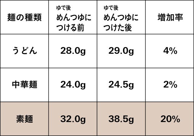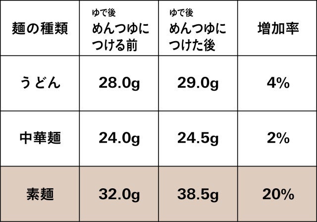 ②各麺を共通のめんつゆにサッとつけ、めんつゆをつける前とつけた後の重量を比較し、付着しためんつゆの重量の増加率を比較する