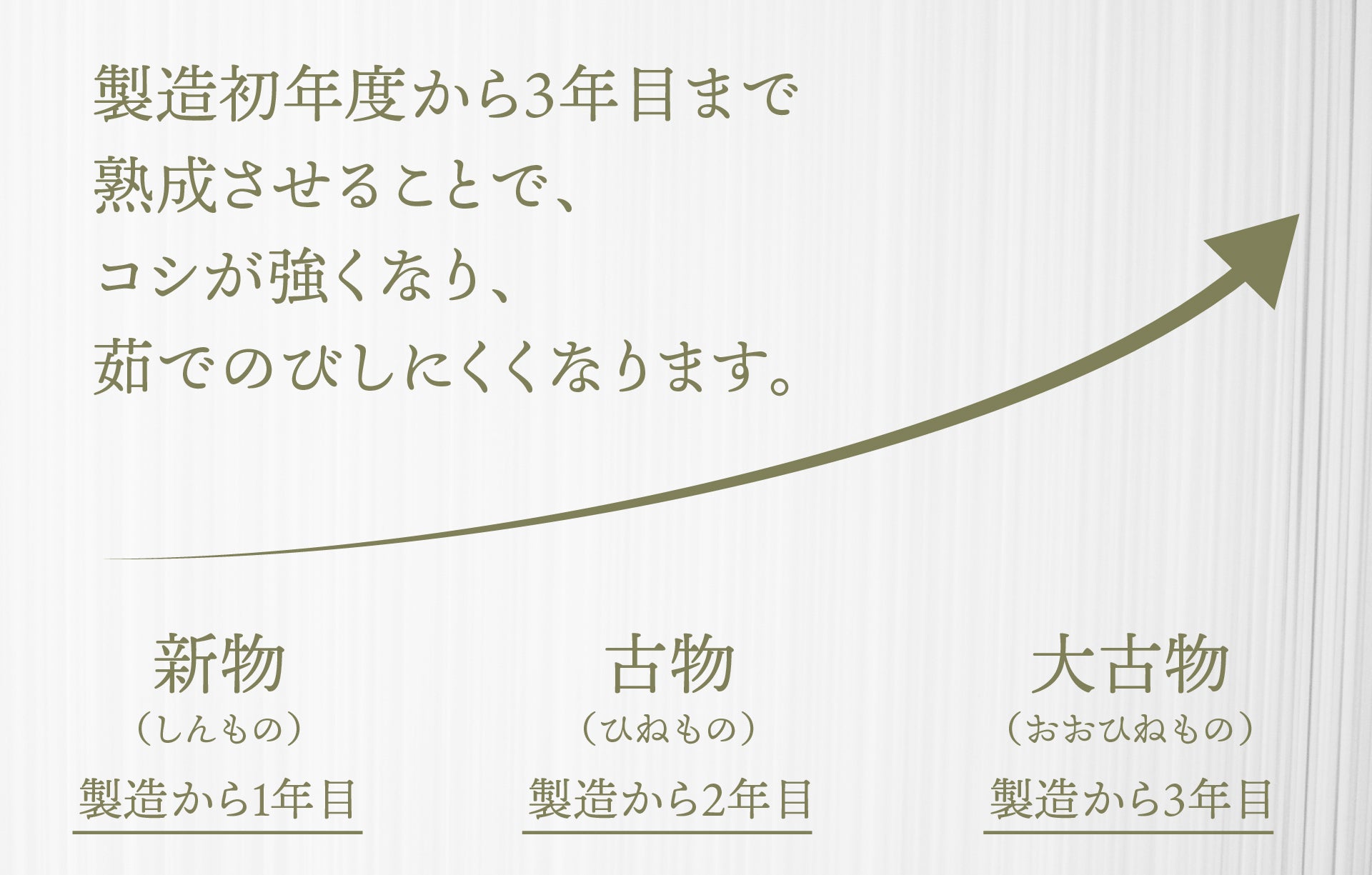 製造した初年度のものは「新物」、2年目を向かえたものは「古物」、3年目を向かえたものは「大古物」と呼ばれています。
