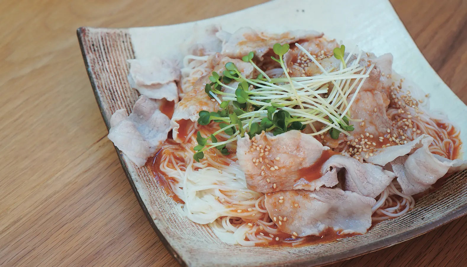ジンジャーつゆ / 縒つむぎ / ゆでた豚肉 / かいわれ / お好みで辣油