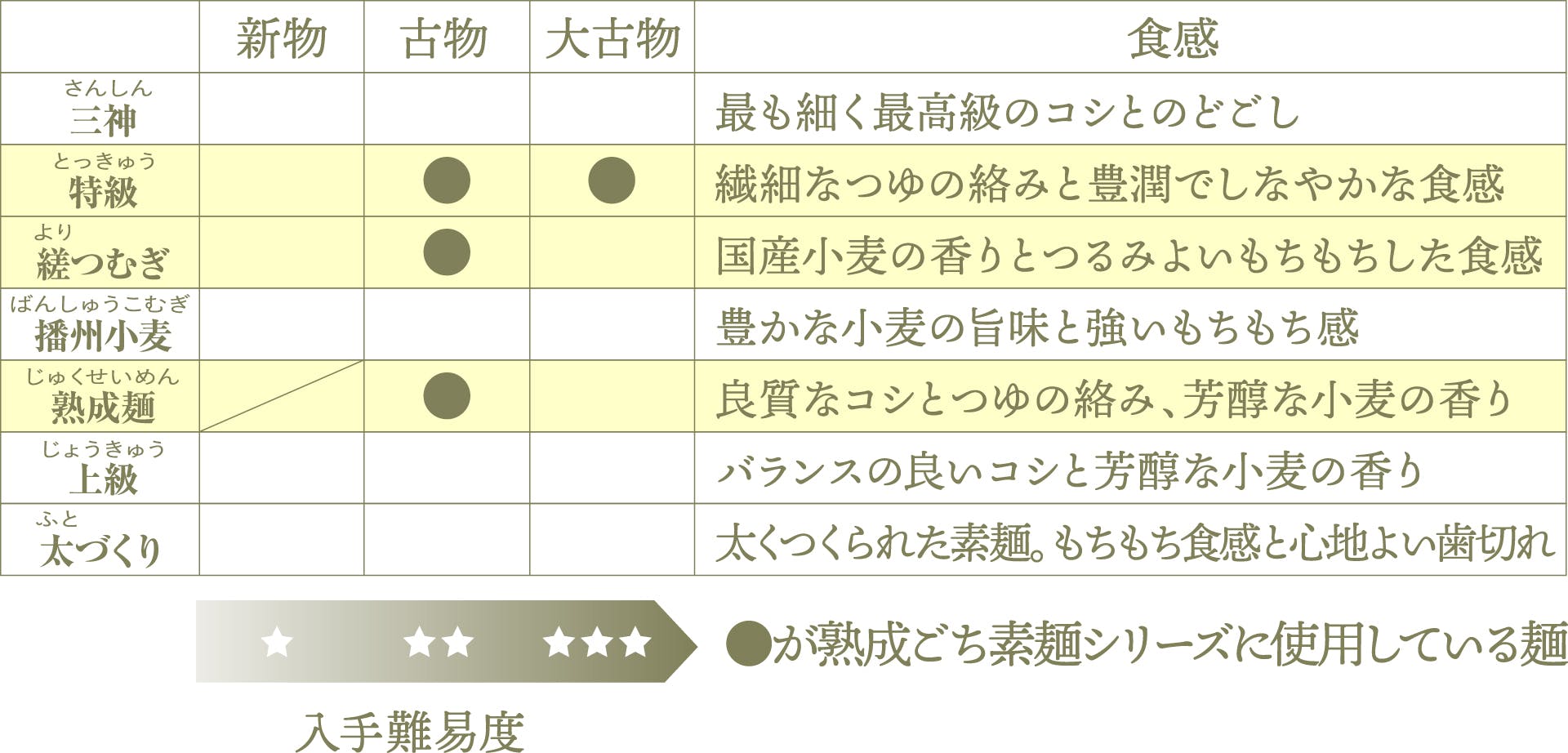 揖保乃糸の奥深さは熟成することに留まりません。sugayaが扱っている素麺はスーパーで販売されている素麺より更にハイグレードな高級素麺。先ほどの熟成年数と合わせて表現すると以下の様な表になります。太さと食感がそれぞれ違う麺のバリエーションをお楽しみください。
