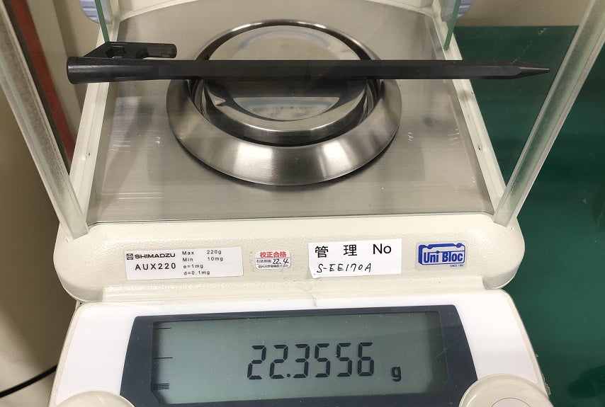 この「繊維直接投入射出成形法」。一般的な射出成形とは異なる工法です。長い繊維をそのまま成形機に入れて混ぜるので、製品の中の繊維が長く残り、強度UPが図れます。今回は、炭素繊維(CF)とナイロン系樹脂を組み合わせ、熱可塑性炭素繊維複合材(CFRTP)を材料としてペグを製作します。この組み合わせは、強度が高く、溶剤などにも強い、軽量化技術の一翼を担う大活躍のプラスチックなのです 。特異技術である「繊維直接投入射出成形法」を用いて 、魅力的な商品をどんどん作って参ります。