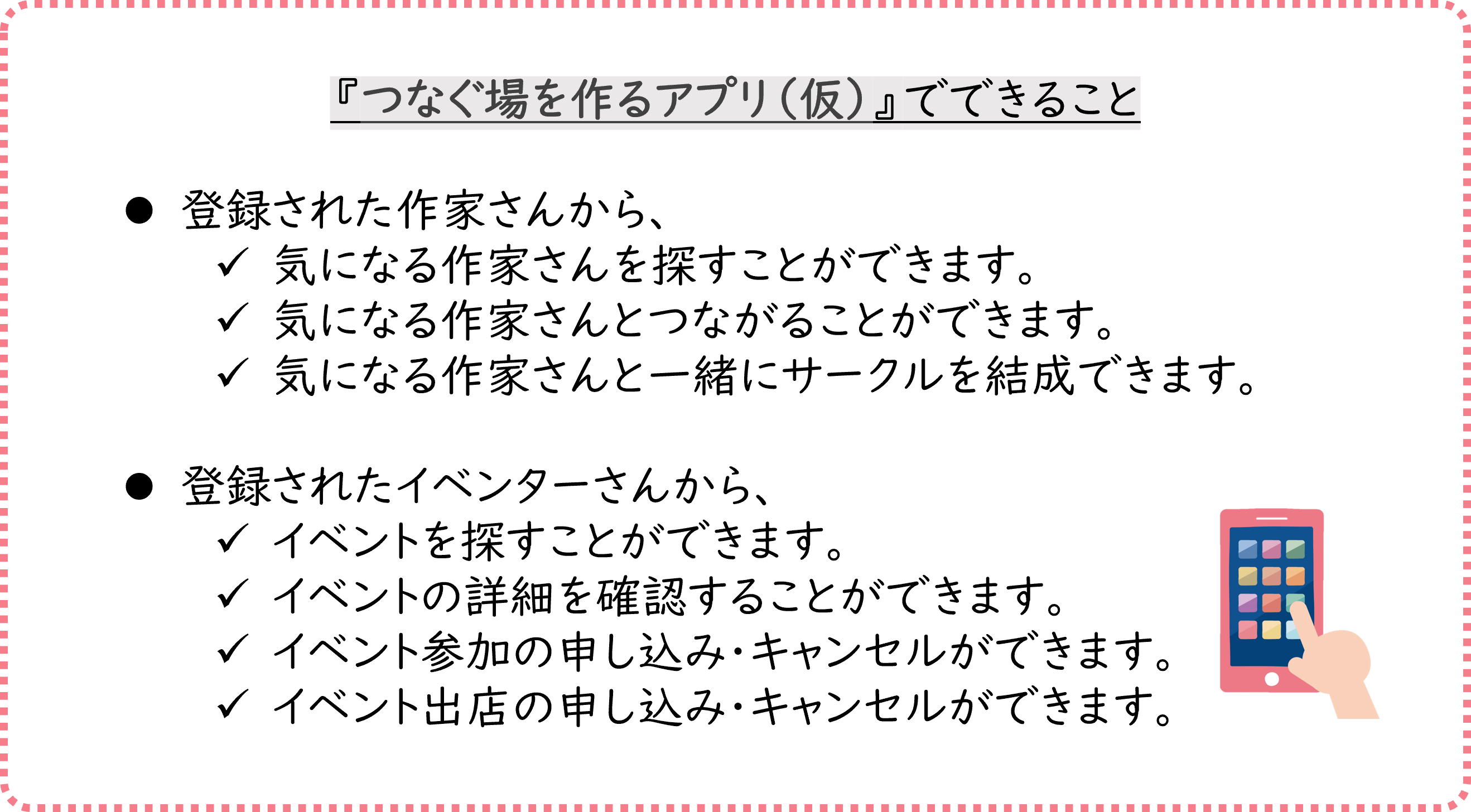 このプロジェクトは、ハンドメイド作家さんの世界と可能性を広げるためのプロジェクトです。今回は、ハンドメイド作家さんとイベント、またはハンドメイド作家さん同士をつなげる『つなぐ場を作るアプリ(仮)』 制作のプロジェクトとなりました。最終的には”つながる場”に加え、”学ぶ場”、”稼げる場”の3つの場を作り、トータルでハンドメイド作家さんをサポートできる体制を整えたい、と考えています。