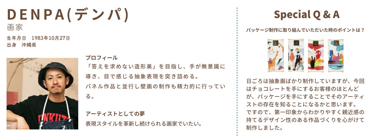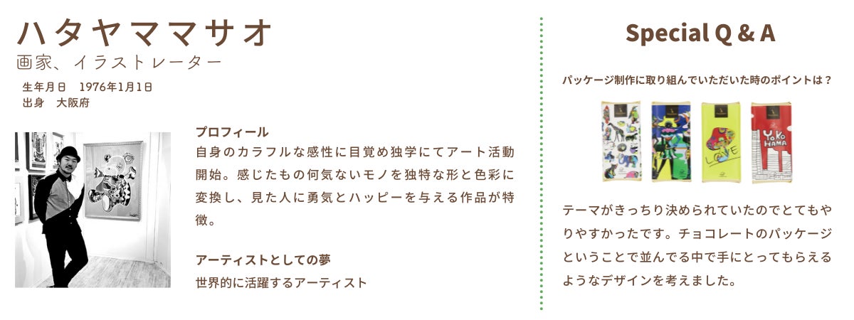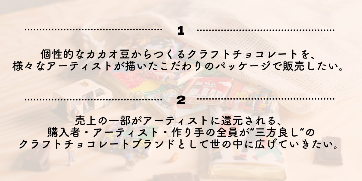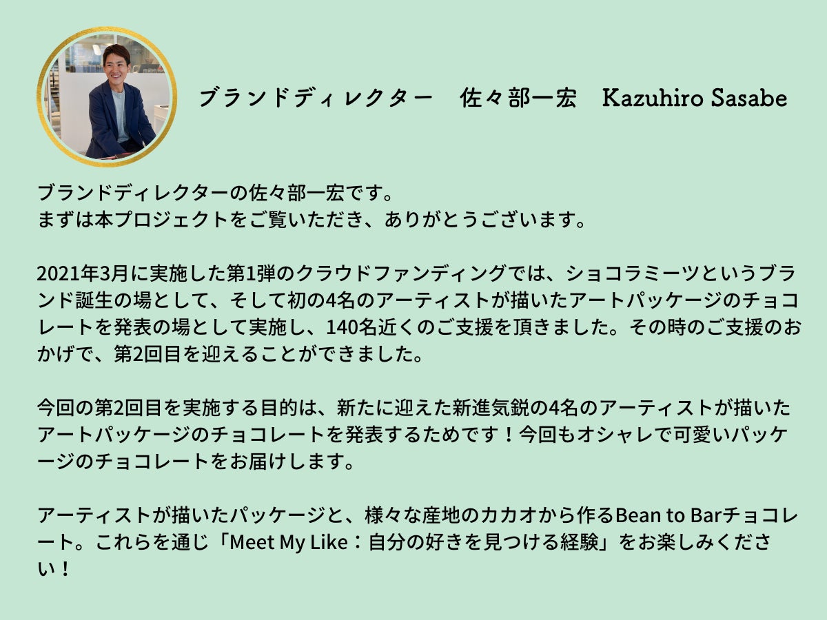• ショコラミーツ代表の佐々部一宏です。前回のプロジェクトから8ヶ月経ち、本日この度、新たに4名のアーティストとコラボし16種類の新しいアートパッケージの発表のプロジェクトをスタートいたしました!第2回目のプロジェクトの目的は、私たちのコンセプト「Meet My Like:自分の好きを見つける経験」をさらに広げるために、ショコラミーツに新たに参加した4名のアーティストさんのパッケージを皆様にご紹介すること。そしてその結果「カカオ豆生産者・アーティスト・買い手・売り手」という、僕たちショコラミーツに関わる全ての人たちの「幸せの循環」をさらに広げていくためです。初めてショコラミーツを世の中に発表した第1回目のクラウドファンディングでは、僕の「Meet My Like」というコンセプト、そして「チョコレートが売れるたびに売上の一部がアーティストに還元される”幸せの循環”の仕組み」に共感をいただき、多くの方からご支援を頂くことができましたそしてその際にお約束したのが、「幸せの循環」をさらに広げるため、さらに多くのアーティストさんとのコラボを増やすことでした。期間は当初の想像よりも少し遅くなってしまいましたが、無事にこうして第2回目のプロジェクトを迎えることができたのは、前回ご支援をいただきました皆様、その後にショコラミーツのファンとして応援していただいてる皆様、そして今回コラボしていただたアーティストさんなど、多くの方々のおかげだと思っております。このプロジェクトの機会を通じて、より多くの方にショコラミーツを知っていただく機会としておりますので、ぜひ今回のプロジェクトご支援やシェアなど、ご協力をお願いいたします。2021年11月18日ショコラミーツ代表 佐々部一宏 もっと見る