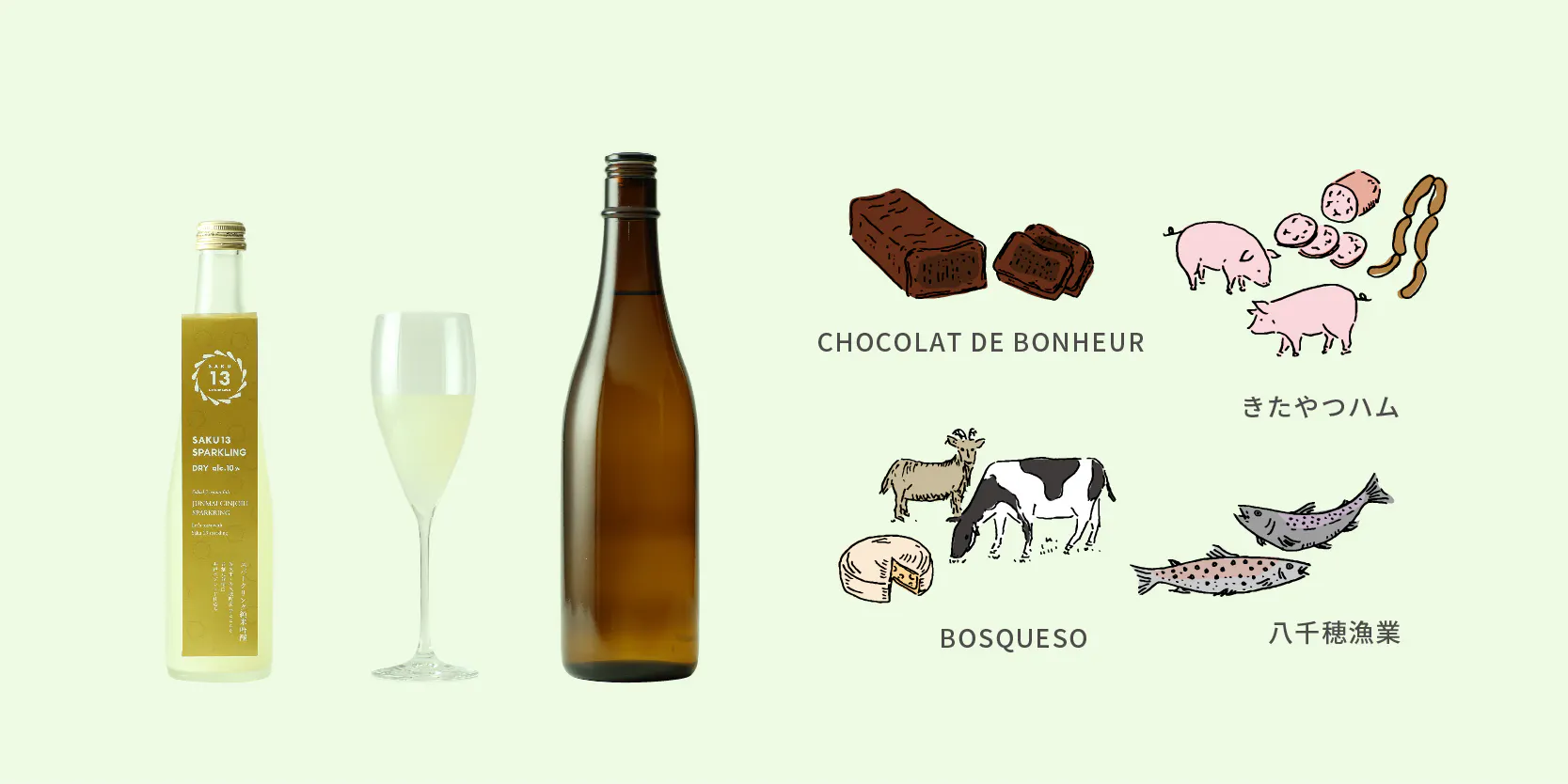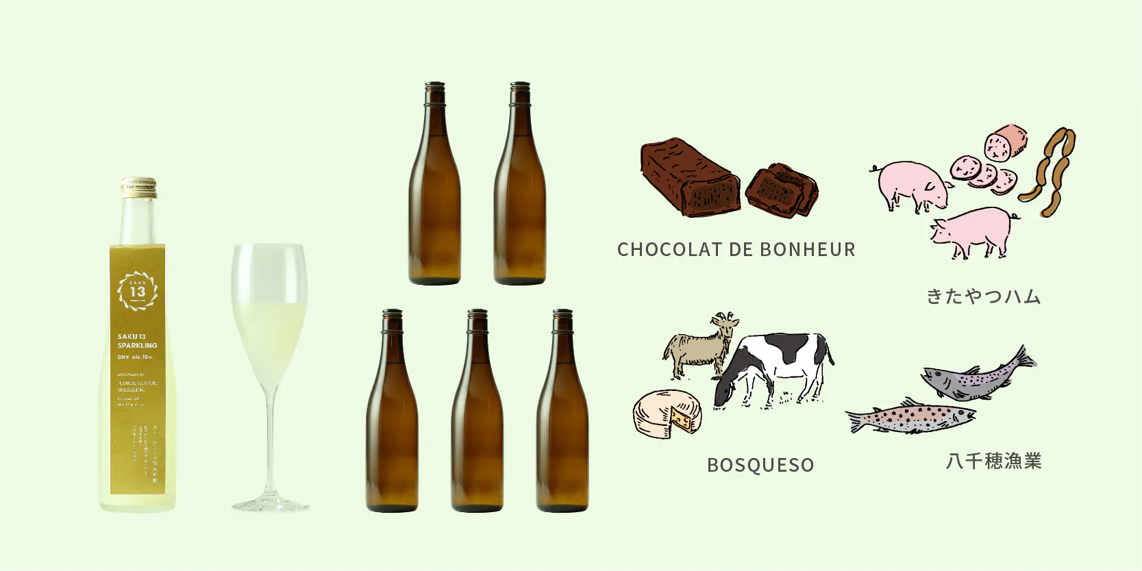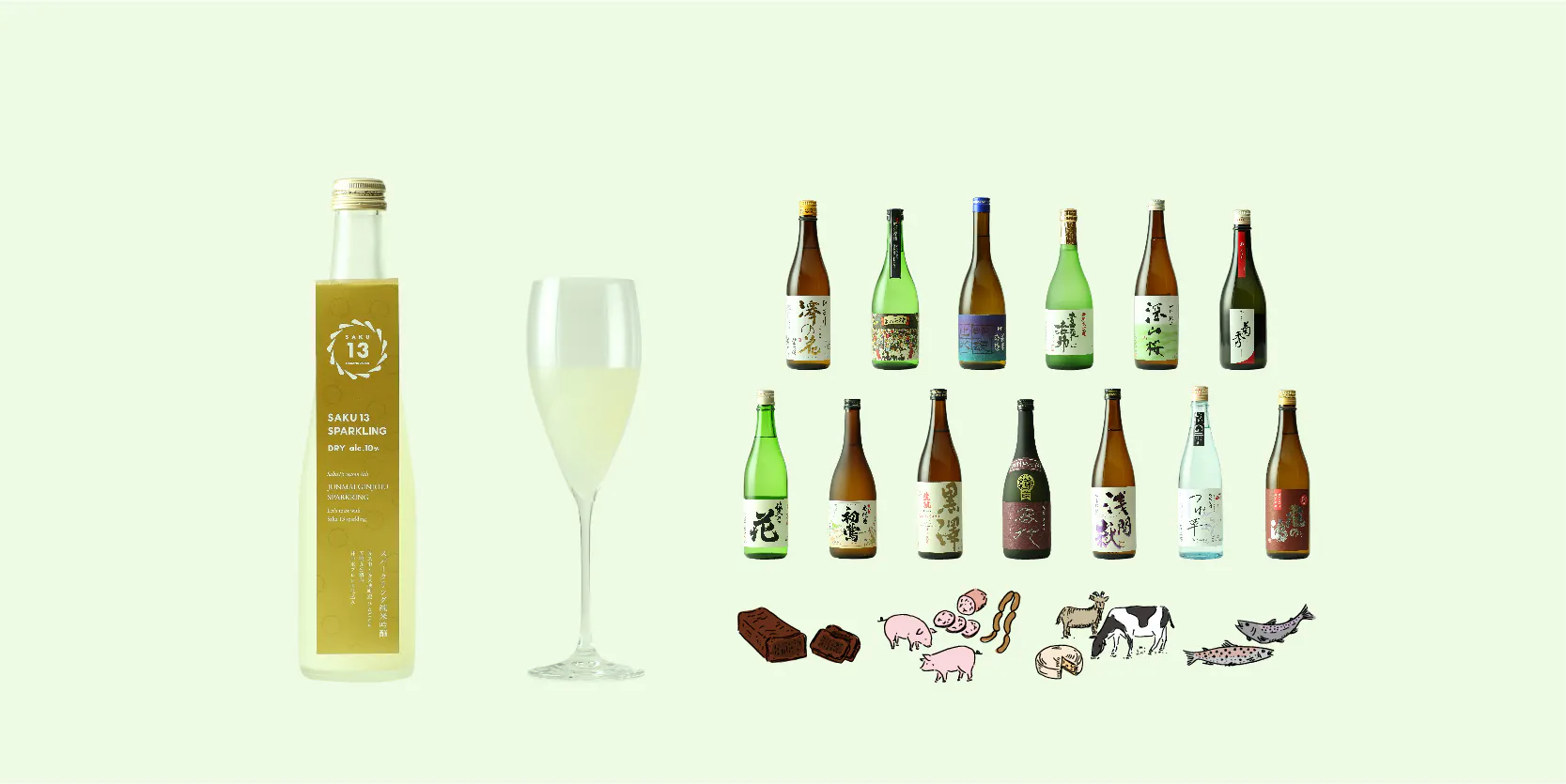 SAKU13 Sparkling Dry のほか、13蔵のオススメ食中酒や佐久のおつまみなどが楽しめます!
