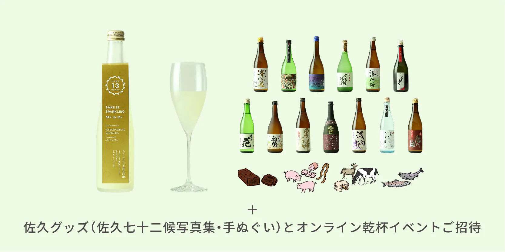 SAKU13 Sparkling Dry(300ml)1本+オススメ食中酒(720ml) 13本+佐久のおつまみ+佐久グッズ (佐久七十二候写真集・手ぬぐいなど)+オンラインカンパイイベント招待 + サンクスカード、送料・消費税込み