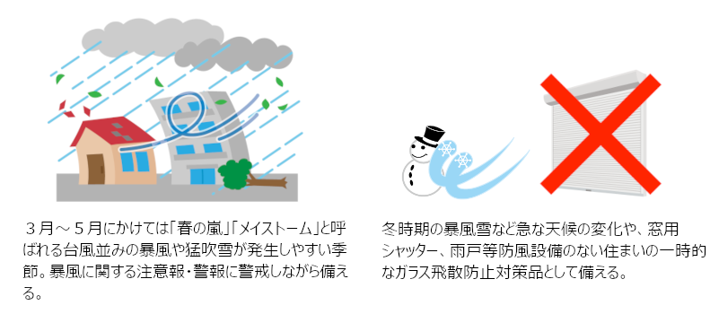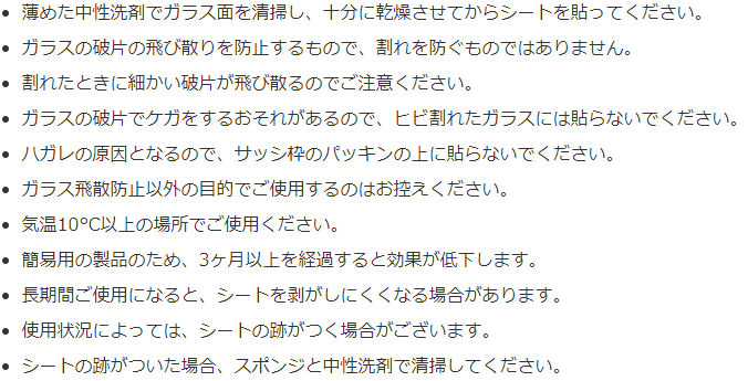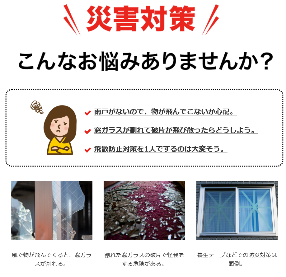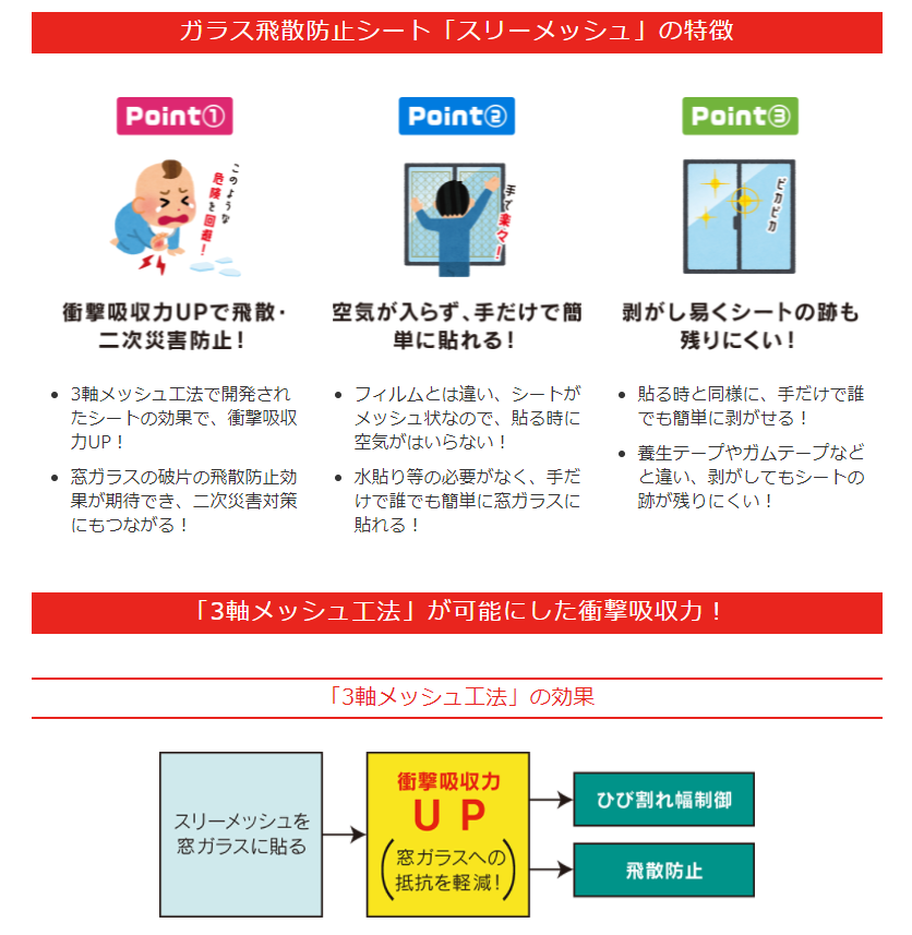 テレビや防災情報では、一般的に養生テープでのガラス飛散防止を対策として紹介されておりますが、殆ど効果がありません。防災は日頃からの準備と、簡単に災害対策ができるかが重要となります。いつどこで起こるかわからない災害に、お役に立てる防災商品を開発し備えて頂けるよう社員一同努めて参りますので、ご支援・情報のSNSでの共有等、ご協力よろしくお願いいたします。