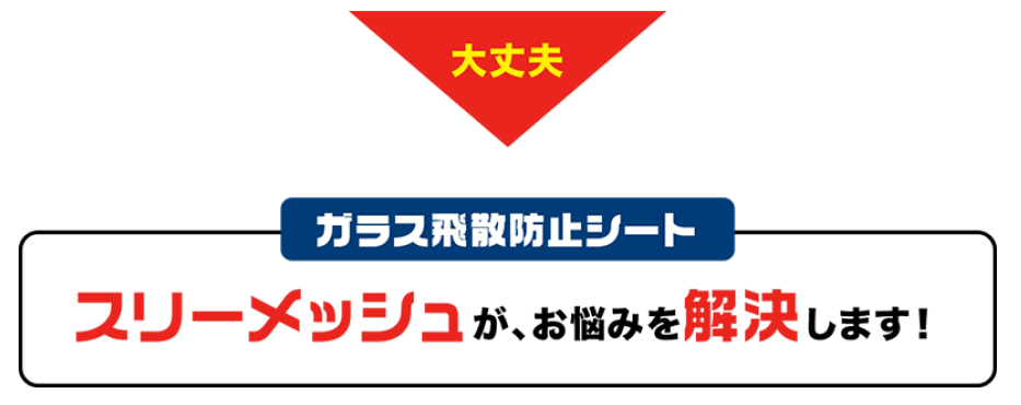 上記の比較表を確認いただければわかるように、それぞれの対策方法には、メリットとデメリットがあります。しかし『スリーメッシュ』で対策すれば、デメリットが少なくガラス飛散防止効果が期待できます。ガラス飛散防止効果を検証した下記の動画をご覧ください。