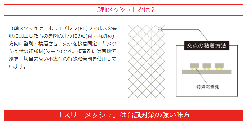 防災資材を取り扱っていく中で、近年の日本は大雨や台風など自然災害が多発し、自主防災の必要性が高まっていることに着目し、この度、メッシュ状ガラス飛散防止シート『スリーメッシュ』を開発しました。