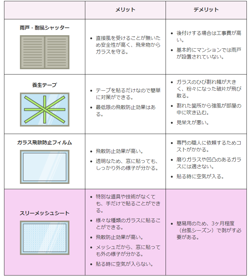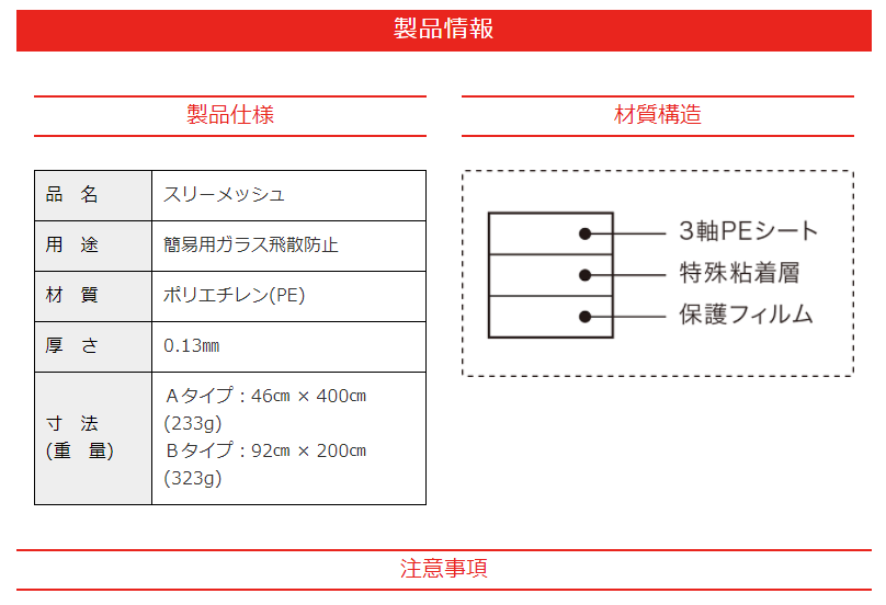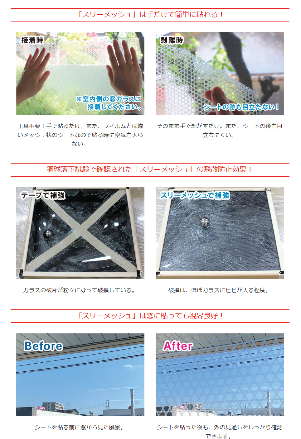 日頃から備えておくことで、台風や急な竜巻・暴風による災害からガラスの飛散を防止します。『スリーメッシュ』は、窓ガラスの大きさにカットし、スピーディに手で簡単に貼れます。