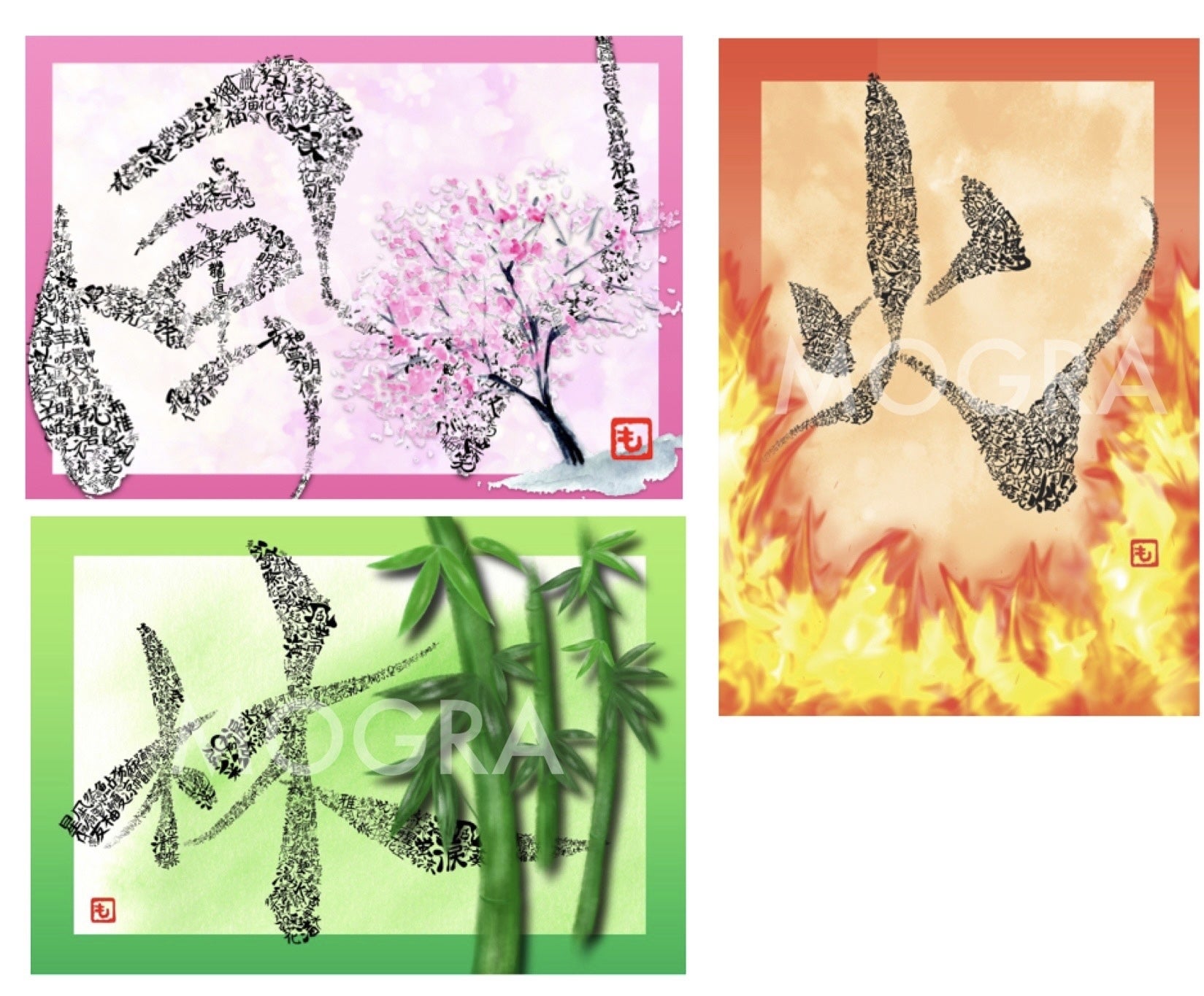 MOGRAオリジナル文字であり、約200〜300文字を書き、1文字の漢字を作成します。1文字1文字筆で書き書いたものをデータ化し、パソコンにて編集を行う作品(グラフィック)と、直接書き込むキャンバス作品の2種類があります。どちらも文字の配置や太さ細さを考慮しながら作成しており、遠目で見た際に、墨の濃淡が出るよう、「止め」は太く大きく、「はらい」は細く小さくすることで表現しています。