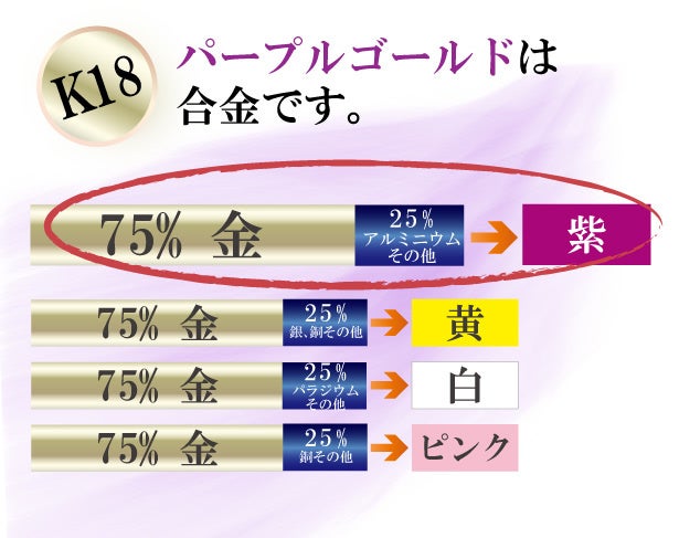 古来より高貴の色とされてきた紫色のパープルゴールドジュエリーが、長い研究の末の新技術開発により、様々なデザインができるようになりました。この鮮やかな紫色に輝くパープルゴールドジュエリーを、ぜひ手に取って頂いてその美しさを堪能してほしいと思います。この紫色のジュエリーが、皆様の日常に彩りを加えることを切に願っております。