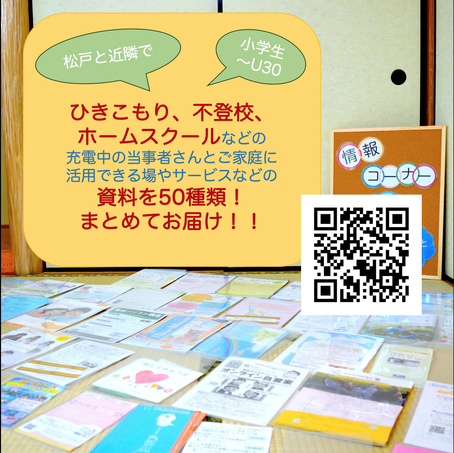 ありがたいことに、私たちを信頼していただいて応援していただいて、お預かりしている資料が50種類を超えました。松戸市と近隣でひきこもりや不登校のお子さんやご家族が活用できる多様なサービスの情報です。