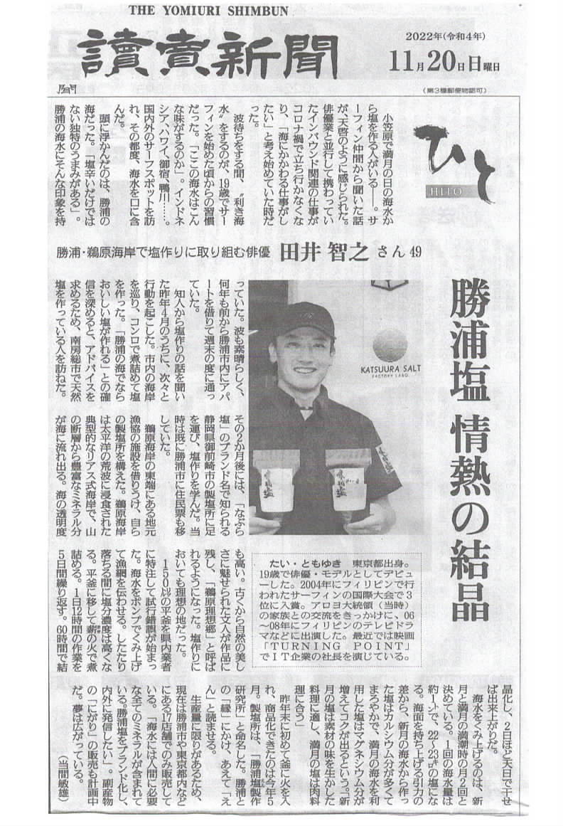 2022/12/29 15:082022年もあっという間に終わろうとしております。勝浦塩製作研究所もお蔭様で年内のお仕事が完了致します。2022年の主なメディア情報です。新聞・2022年1月3日(月)千葉日報 (2面・統合地方)2/3掲載・2022年2月7日(月)千葉日報(1面・忙人寸語)掲載・2022年5月18日(水)千葉日報 (3面・県南)1/4掲載・2022年11月20日(日)読売新聞 (千葉版)1/4掲載テレビ・2022年2月23日 BS日テレ「三宅裕司のふるさと探訪・千葉県勝浦市の旅」・2022年4月29日 千葉テレビ「てくてく散歩」雑誌・Daytona(デイトナ)2022年5月号Vol.360 7ページ掲載・Blue.(ブルー)2022年12月号No.96 4ページ掲載ラジオ・FM BAYFM78 2022年8月29日 番組『YOU 遊 チバ』勝浦塩製作研究所紹介・FM J-WAVE 2022年12月10日 番組『BLUE IN GREEN』 ラジオ出演(敬称略)沢山のメディア様に取り上げられまして、本当に有難う御座いました。お陰様で勝浦塩を使っていただける会社様も徐々に増えてきました。三日月シーパークホテル様、西川水産様、勝浦商店様、新勝浦市漁協駅前売店様、新勝浦市漁協海中公園店様、おさかな村様、佃煮近江様、旅館松の家様、マリブポイント様、ブラックラムズ様、おしだり寿司様、勝美寿司様、御宿スタンド様、OSSA様、ベーカリーAYA様、みおや様、いろや様、勝浦東急ゴルフコース様、東急ハーベストグラブ様、勝浦東急サニーパーク様、ソルトグループ様、リキャンプ様、ブルーベリーヒル様、プチハーベスト様、群馬鮨おばな様、福岡伍り寿し様、サヤンテラス様、ペッシュドヒョータン様、かねなか様、心ごはん結卯様、梵まるプリン様、鴨川温泉 璃庵様、ロマン亭様、鵜原館様、宍倉商店様、鈴鹿COWABUNGA!マリーナ様(順不同)有難う御座います。心より感謝申し上げます。2年目の2023年もコツコツと真心を込め皆様に勝浦の美味しいお塩をご提供出来る様に邁進してまいります。皆様のご健康と御多幸を心からお祈りいたします。2022年12月吉日勝浦塩製作研究所田井智之 もっと見る