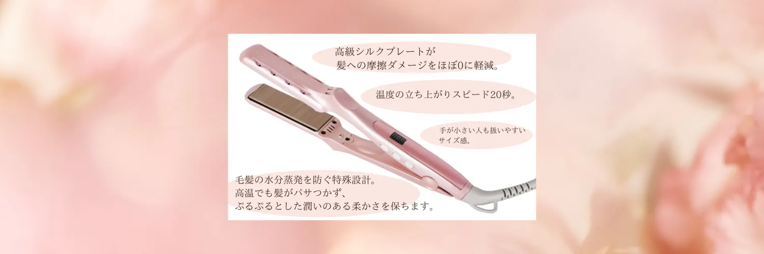 ──── ヘアアイロンの髪を挟む部分に特殊加工の高級シルクプレートを使用することで、髪が高温状態でも極限まで水分蒸発を抑えることで髪の中の水分が一気に蒸発せず、タンパク変性により髪が硬くならないため、パサつかずに柔らかいぷるぷるの質感のアイロンヘアーが実現でき、さらに摩擦が最小限に抑えられる効果で枝毛や切れ毛を最大限に予防が可能・・・まさに「ヘアアイロンをしてるのに髪が傷んだ感覚にならない」「アイロンする前より、アイロンした方が髪がぷるぷるに柔らかくて綺麗になる」ヘアアイロン。
