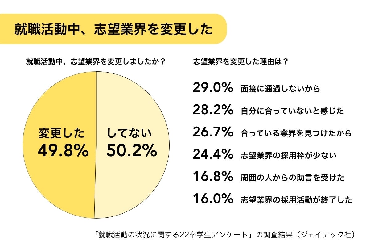 実際に半数近くの学生は、就職活動半ばで、業界を変更するといったデータも出ています。