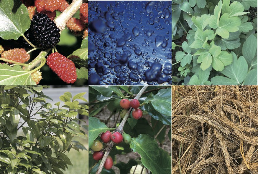 桑の実、海洋深層水、長命草、ヤブニッケイ、コーヒー、もち麦
