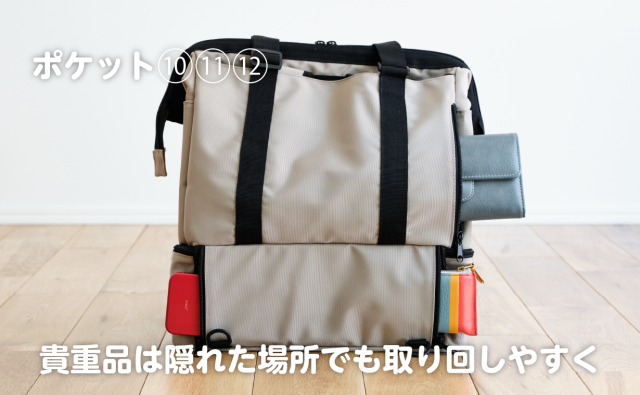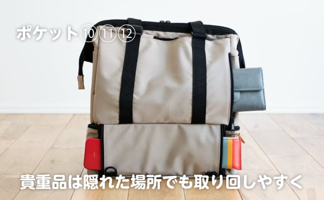 カバンの背中側には隠れた3つのポケットがあります。財布や鍵、スマホなど、使用頻度の高い貴重品を入れるのに最適です。