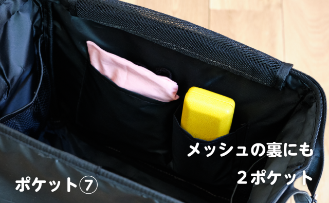 宙に浮かぶメッシュポケットの裏には、左右の大きさが違う2つのポケットがあります。