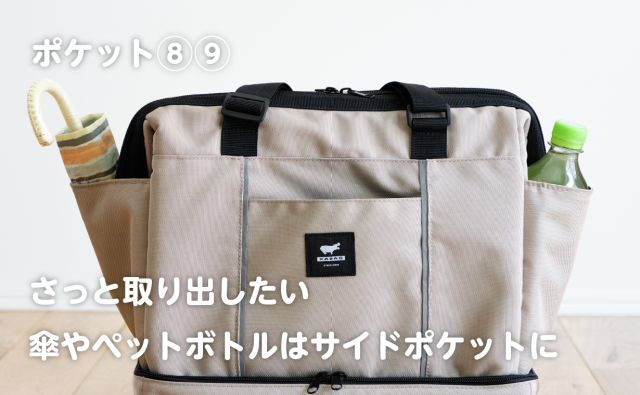 カバンの外側サイドには、折り畳み傘やペットボトルが入ります。裏地には透明なビニール素材を用いているので、濡れていてもカバンの中まで浸透することはありません。