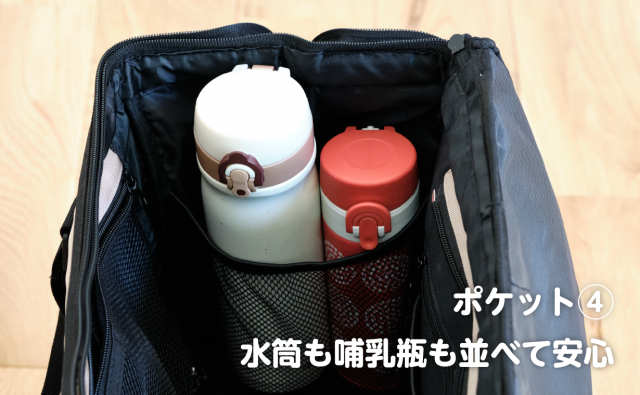 サイドには水筒を2本並べられるメッシュポケットを設けています。ゆとりがあるのでポーチなども入ります。