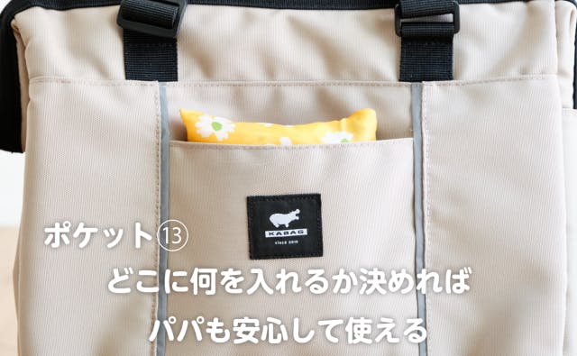 上部は取り出し口が広く、内外合わせて13のポケットがあるKABAGマザーズは、仕分けしやすさ、取り出しやすさが特徴のひとつ。