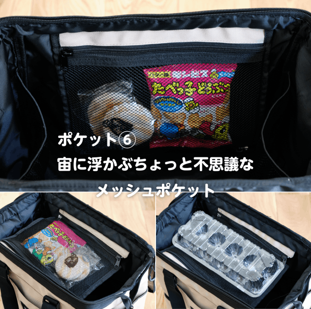 メッシュポケットを持ち上げてチャックを締めれば、宙に浮かぶ不思議なメッシュポケットに。他の荷物に押し潰されることもないので、壊れやすいものはここに決まり。