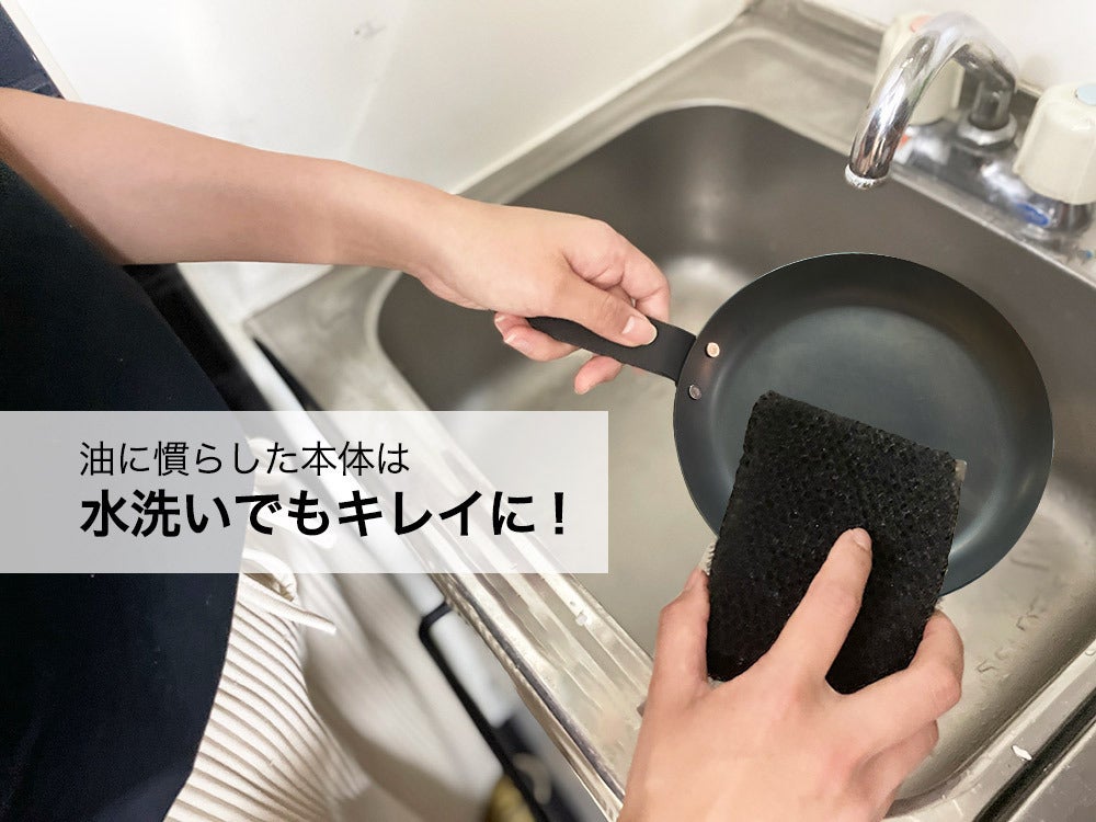「忙しい朝に洗い物は減らしたい...」「洗い物がめんどくさい...」そんなあなたにピッタリなサイズ感。油に慣らした本体は「するん」と一拭きで綺麗に洗浄。洗い物が苦にならりづらいのもミニフライパンの魅力の一つです。
