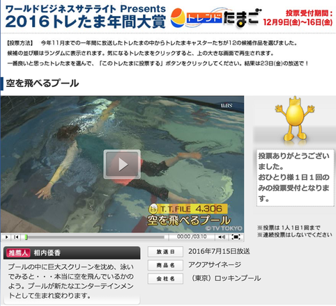 2016/12/10 12:46【トレたま年間大賞獲得に向けてのお願い】 この度、東京プール研究室で開発したアクアサイネージがWBS(ワールドビジネスサテライト)のトレンドたまご年間大賞候補作品にノミネートされました!! www.tv-tokyo.co.jp/wbs/toretama2016/006.html 1年間で放送された250本の中からトレたまキャスターが選んだ候補作品ベスト12にランクインです! これもアクアサイネージのクラウドファンディングに協力してくださいました皆さんのおかげです!本当にありがとうございました! 現在、視聴者から投票で1位を決定する総選挙が上記のトレたまサイトで開催されております。 12月23日まで毎日1人1回投票できるシステムとなっておりますので、トレたま年間大賞獲得に是非ご協力ください! 1位を獲得したあかつきには、12月23日の生放送授賞式で、クラウドファンディングに協力していただいた全ての方の名前を記載したオリジナルTシャツを着て出演します!そして年明けにアクアサイネージを体験できるイベントを開催します! やるからには皆さんと一緒に日本のテッペンを獲りにいきたいと思います!!そして、日本中にプールの可能性を届けます!! 大賞獲得に向けて一日一回のワンクリック宜しくお願い致します!! アクアサイネージ詳細↓http://aquasignage.rockinpool.com もっと見るトレンドたまご年間大賞候補作品にノミネートされました!!