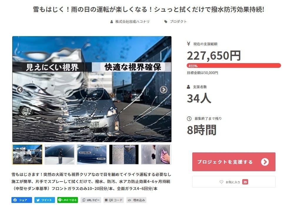 2022/01/24 14:37ご支援者の皆様本日の東京は晴れです。GSPRAYの施工日和となっています。皆様の手元に【GSPRAY】が届いている頃でしょう。もしも、届いていない方がいらっしゃいましたら、至急連絡下さい。手元に商品が届いている皆様、近日中の雨、雪、汚れに備え、施工頂き、感想頂けると有難いです。メーカーも研究熱心なので日本での反応が気になるようです。皆様の感想やご意見が、より良い商品にしていく為に役立ちます。お手すきの際で構いませんので、こちらにお知らせ頂けるか、メール頂けると幸いです。株式会社容成ハコナリスタッフ一同yousei@hakonali.com もっと見る1月15日でBOOSTERクラウドファウンディングは終了しました。ご支援有難うございました
