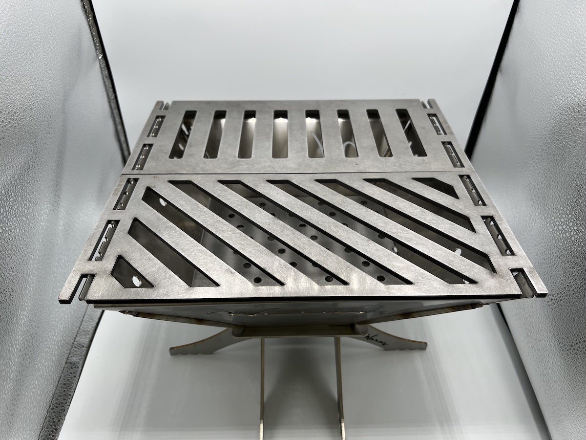 空気孔は、斜線構造、縦線構造の2枚を採用し、薪火力の熱伝導性、空気の通風性を飛躍的に高めています。厚み(M型4.5mm/L型6mm)鉄純度99%の鉄板は、ケトルや、やかんの他、コッヘル、クッカーなどの調理器具を置ける対荷重性にも優れています。