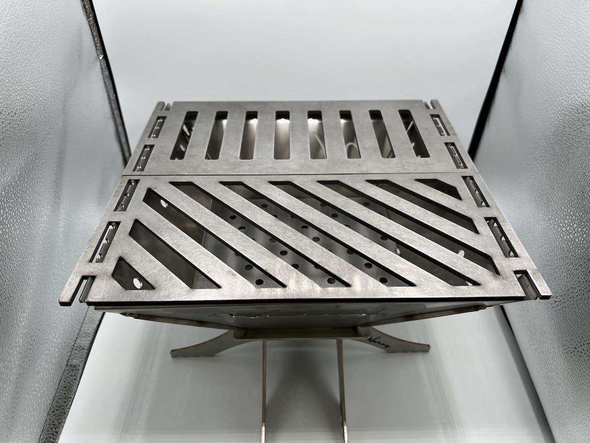岩上さん「今回の製作にあたり自分としてもオリジナルの焚火台は欲しく、興味がありました。実際の製作にあたりサンプルを作り文字の位置・大きさを数センチずらしたり時には数ミリずつずらし各部の調整を行いました。材質も長く使用していただけるようさびにくいステンレスで、厚みも既製品の焚火台より厚板で作成しています。重量感はありますが・・・。