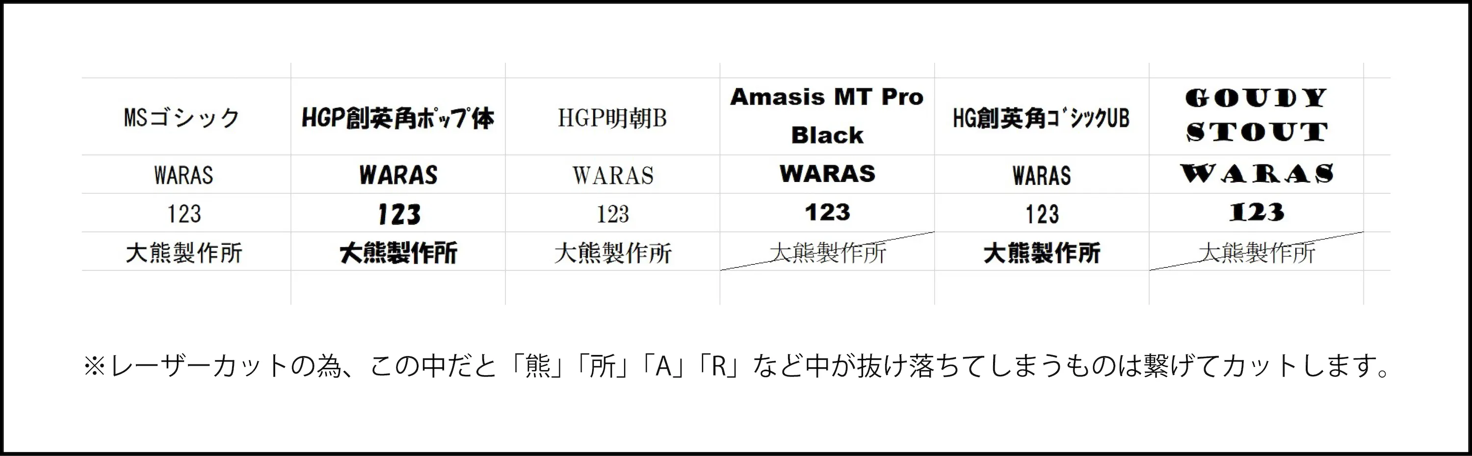 6種:MSゴシック / HGP創英角ポップ体 / HGP明朝B / Amasis MT Pro Black / HG創英角ゴシックUB / GOUDY STOUT