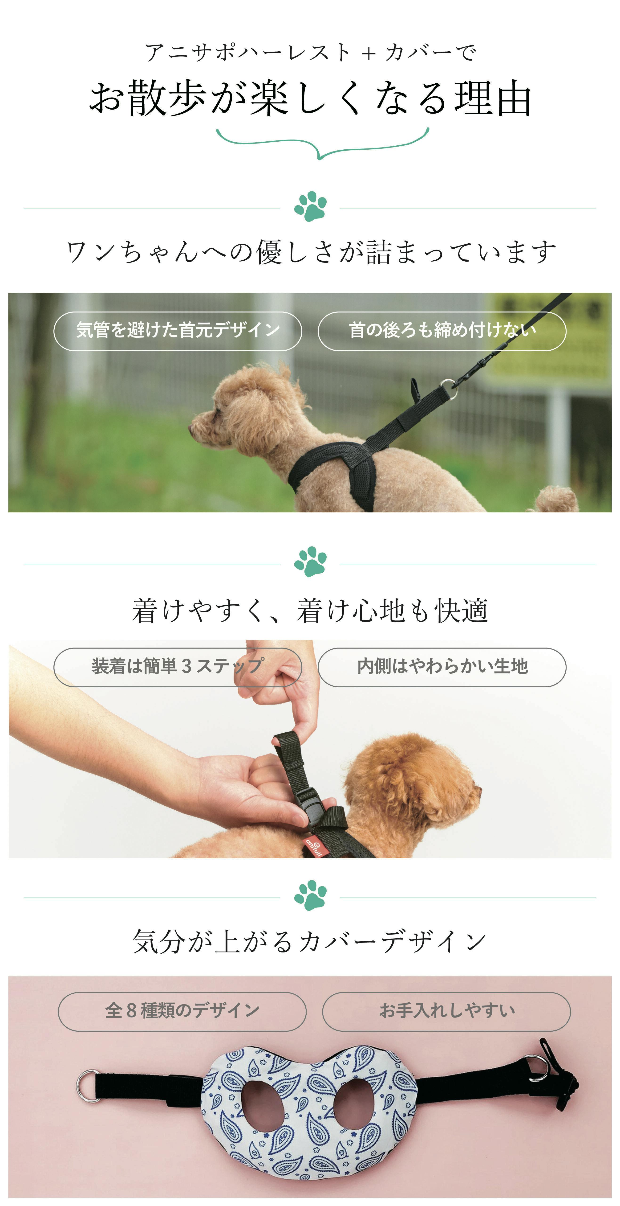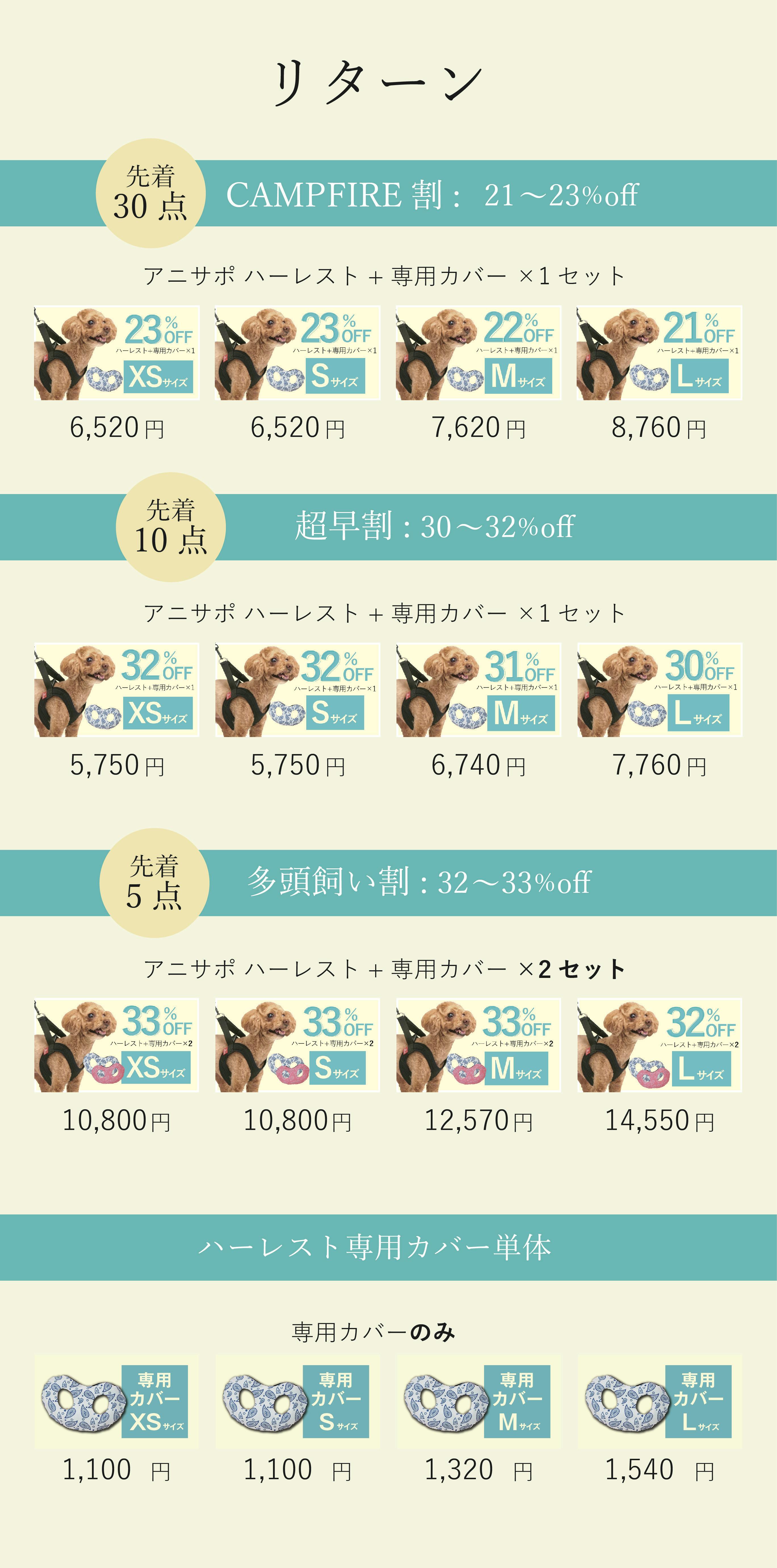 2021/11/25 15:05『愛犬の気管にやさしいハーネス+専用カバー』プロジェクトを開始いたしました!------------------------------------------------------------飼い主さまの毎日の日課である「愛犬とのお散歩」。あまりリードを強く引っ張ると愛犬が苦しそうだから、気を付けてお散歩しているけど…ふとした時にゴホゴホする愛犬を見ると、楽しいはずの時間も、不安で仕方ない…!そんな飼い主さまの声を形にした、思いやりのハーネス。今回のプロジェクトでは、かわいいデザインが楽しめる「専用カバー」と、ハーネスをもっと幅広いワンちゃんに使っていただくために「Lサイズ(小型~中型犬用)」が新登場!プロジェクトの公開期間は、2021年11月15日(月)~12月19日(日)まで となっております!最大33%OFFでご注文できる、数量限定のコースもございます!ぜひこのプロジェクトで、愛犬との楽しいお散歩ライフをお過ごしください!! もっと見る