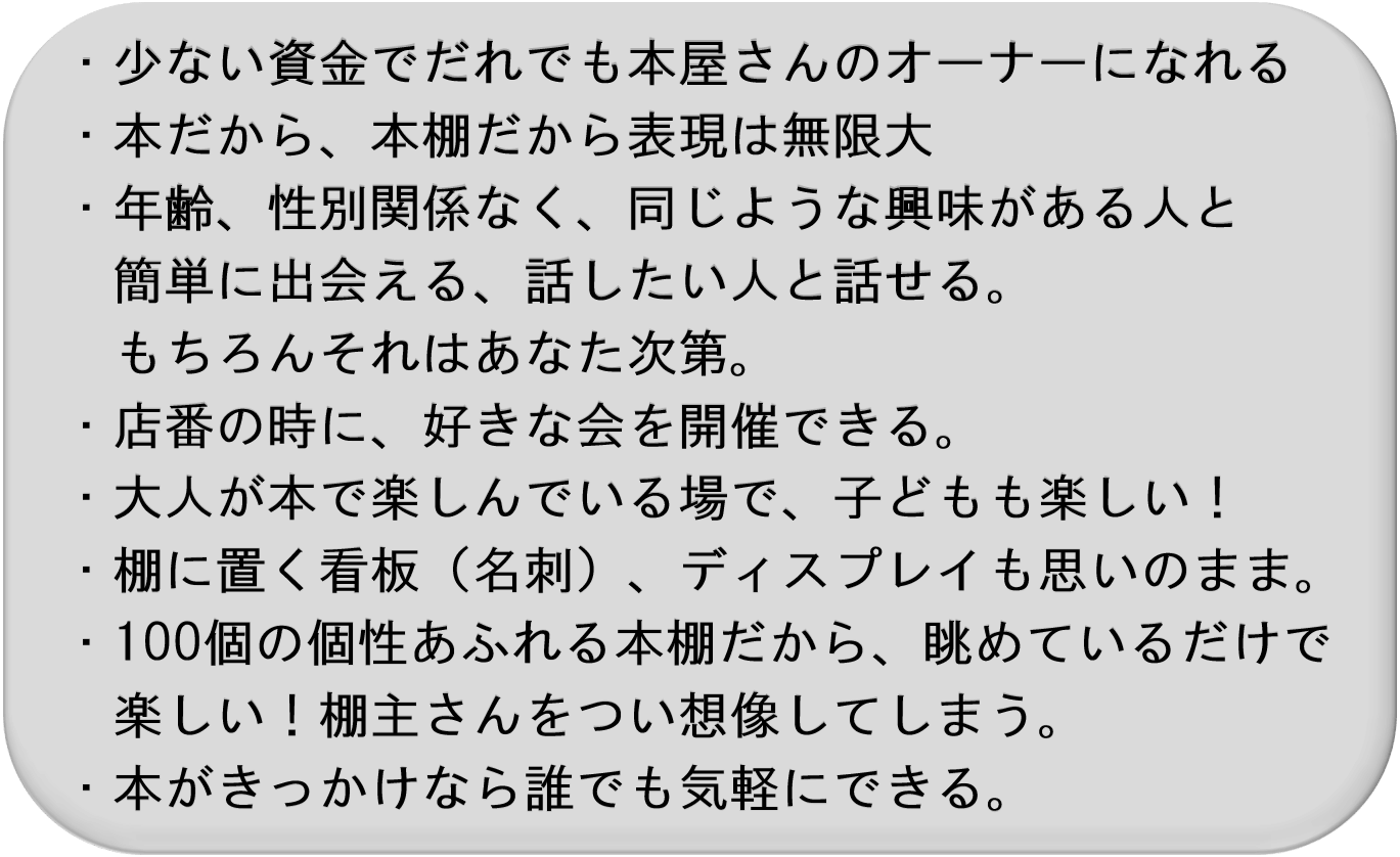人件費はかけず、棚主さんでお店番(2~3か月に1回位)をして頂く、お店番がいない時は営業しない、などシェア型本屋さんスタイルを楽しんで頂ける方、