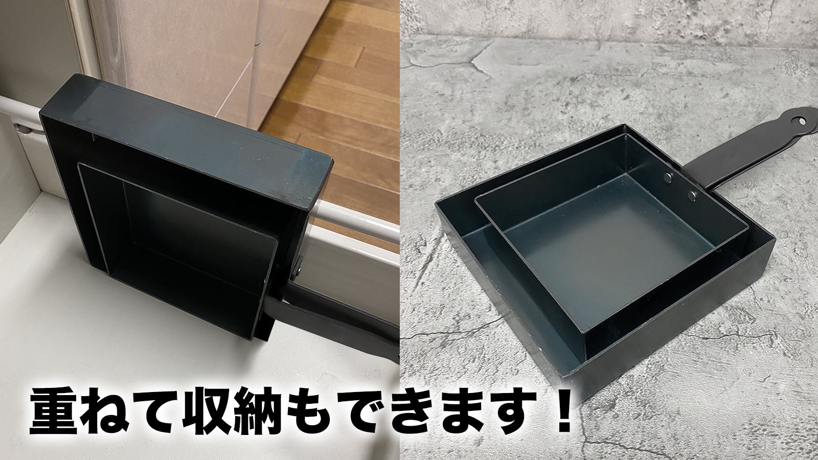 四角いフライパンは立てて収納したり、重ねて収納したりすることができます!