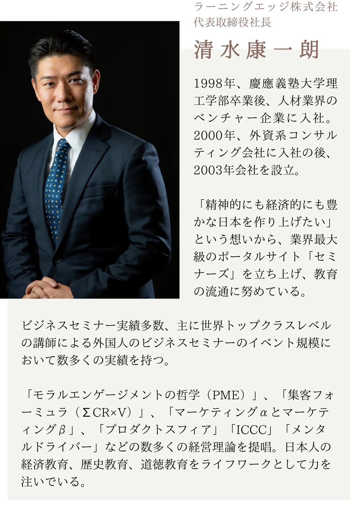 はじめまして。ラーニングエッジ株式会社 代表取締役 清水康一朗と申します。数あるプロジェクトの中からこのページをご覧いただき感謝申し上げます。