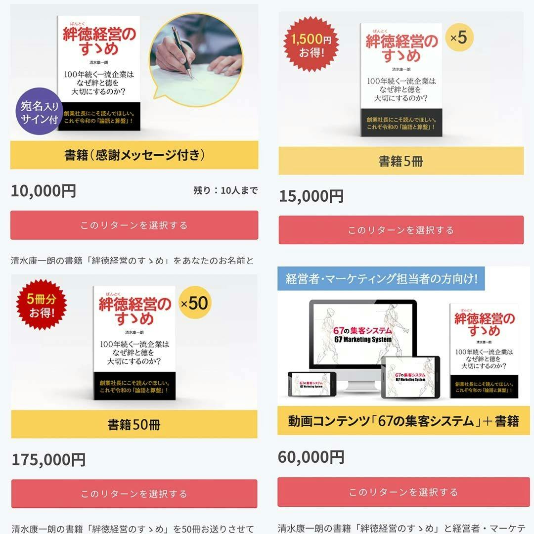 2021/12/08 18:30こんにちは。フローラル出版クラウドファンディング事務局でございます。みなさまこの度はご支援・ご協力のほど誠にありがとうございます。事務局一同心より感謝申し上げます。そして、この感謝の気持ちをどうにか形にすることはできないかと考え、清水さんとも相談させていただき、この度追加で新たなリターンを用意することができました!簡単にですが、追加させていただいたリターンについてご説明させていただきます。1、宛名入りサイン書籍(感謝メッセージ付き)こちら数量限定にはなりますが、支援者様の宛名と清水さんの直筆サインが書かれた書籍となります。※ご支援いただく際は、必ず概要欄に支援者様の宛名を正確にご記入ください。支援いただいた後、事務局からキャンプファイヤーのメッセージ機能にて、再度記載する宛名に関してご確認させていただきます。2、経営者やマーケティング担当者の方向け動画コンテンツ「67の集客システム」+書籍1冊(感謝メッセージ付き)こちらは、少し実用的なリターンとなっております。日頃からビジネスを頑張ってらっしゃる方向けに、清水さんに特別に用意していただいたリターンになります。※支援いただいた場合コンテンツのお渡しは1月10日以降に順次ご登録いただいているメールアドレス宛に手配させていただきます。3、書籍セット5冊と50冊(感謝メッセージ付き)こちらはそれぞれ書籍の複数冊セットになります。個人スポンサーや企業スポンサーをご支援いただいた方々に、ぜひご自身の周りの方にそれを広めていただきたいと思い、お得なセットを増やさせていただきました。ぜひ、周囲の方に配ったりする際にこちら利用いただければと思います。追加リターンは以上となります。ご興味を惹くものがあればぜひご検討いただけると嬉しいです!引き続き本クラウドファンディングをどうぞよろしくお願いいたします。フローラル出版クラウドファンディング事務局 もっと見る