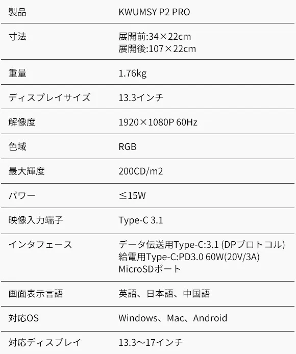 「KWUMSY P2 PRO」は、1本のケーブルでノートパソコンに2画面を追加できる、最新型デュアルモバイルディスプレイです。