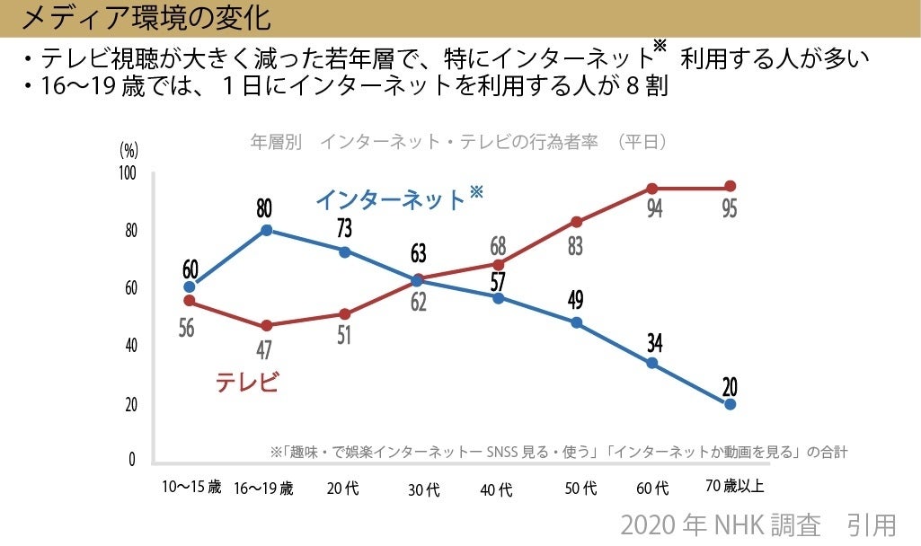 上の表のようにテレビ視聴の現状は若い世代のテレビ離れ・テレビを見ている方の高齢化が進んでいます。若い世代へは、テレビCM(動画広告)では届けられないのが現状ではないのでしょうか?