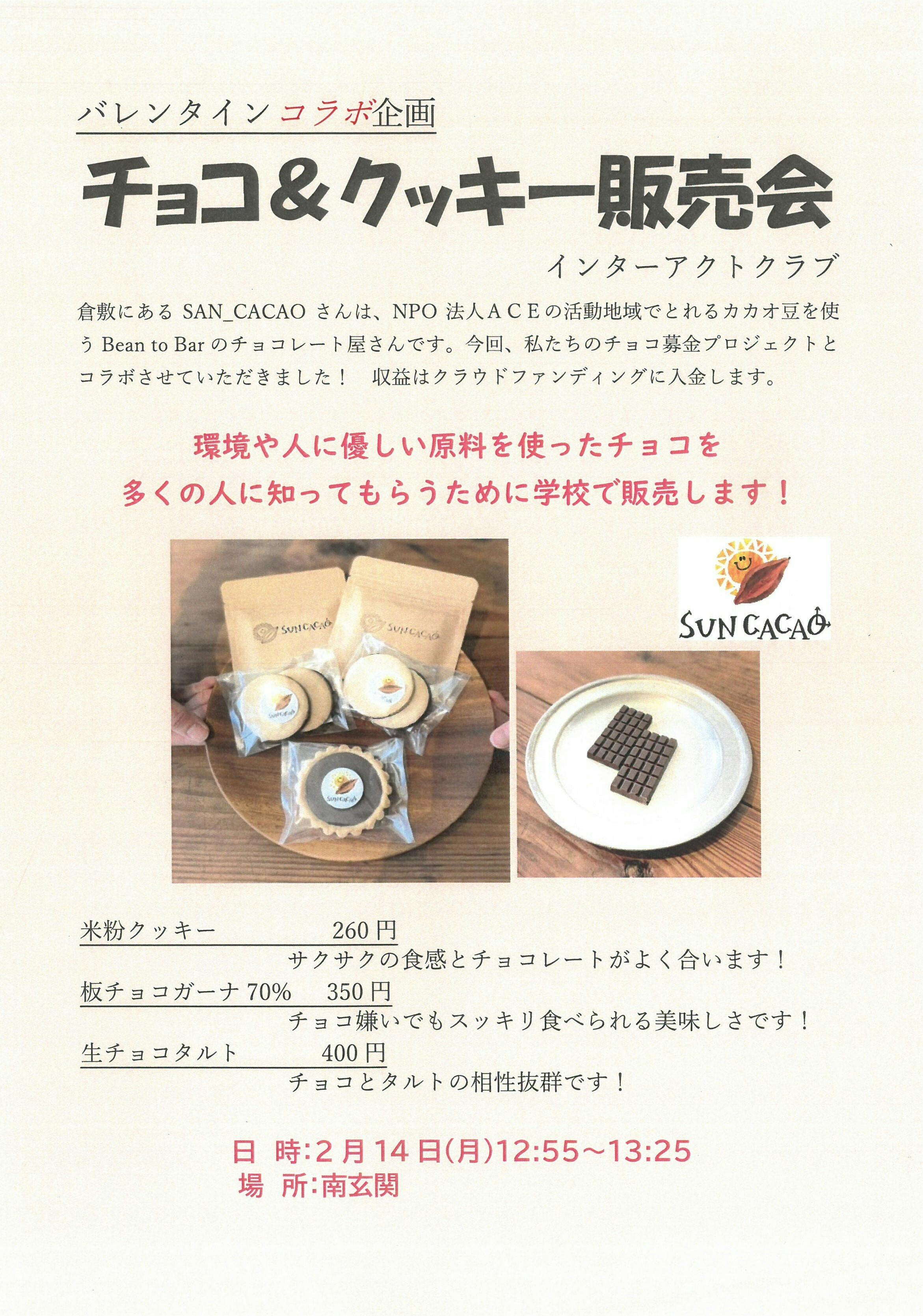 2022/02/15 17:352月14日はバレンタインデー。インターアクトクラブは、倉敷のSUN_CACAOさんとコラボして、校内でチョコ&クッキーの販売会を実施しました。昼休憩になったとたんに、販売会場には生徒のみなさんの行列ができてしましました。用意した商品は、わずか10分で完売! Bean to Barのチョコのおいしさとガーナの子どもたちのことが伝えられたかな、と思います。今年は特別なバレンタインデーになりました。 もっと見る