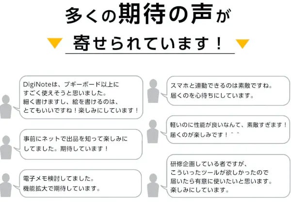 2023/12/09 12:00お世話になっております。MKトレードです。 本日、『T-Note2』を公開させていただきました! 大変反響をいただいた初期モデル『T-Note』発表から2年が経ちました。充電ポートが待望のType-Cとなりました。 今回もツバメノート社推奨デジダル文具として、ツバメモA5(方眼)が付属します。 ★新商品『T-Note2』https://camp-fire.jp/projects/view/719281『T-Note2』は、メモ帳やノートに書くようにパソコンやスマホに書き写すことができます。①手書きメモをリアルタイムで「デジタル化」②パソコン上に「手書き」で同時表示出来、オンライン会議にも使用できる!③専用スマホアプリで同時描写もできる!④「ツバメノート」の『ツバメモA5』を付属!書きやすいフールス紙⑤「スタイラスペン先」を使って紙を節約! お得なリターンは「数量限定」となります。 この商品をもっと多くに方々に知っていただきたいと思っておりますので、SNSなどでのシェアなど大歓迎です! ぜひお見逃しなく、ご検討をどうぞ宜しくお願いいたします! ---------------------------------------------------■リピーター様向けキャンペーン■今回のプロジェクト『T-Note2』をご支援いただいたリピーター様に対して「先着50名様 オリジナルポケットメモ帳プレゼント」いたします!★応募方法★今回のプロジェクト『T-Note2』をご支援のうえ、「メッセージを送る」より下記を記載してご応募ください。・過去にご支援くださった弊社プロジェクトの商品名・過去支援ID・氏名--------------------------------------------------- 最後まで、どうぞよろしくお願いいたします。https://camp-fire.jp/projects/view/719281 『T-Note2』プロジェクトスタッフ一同************************************************************★同時開催中プロジェクト 『DigiNotePro3』画期的な電子タブレットhttps://camp-fire.jp/projects/view/717657 ++++++++++++++++++++++++++++++++『LetSketch』300dpi小型サーマルプリンターhttps://camp-fire.jp/projects/view/681331追加購入などに便利な「MKTrade限定公開ショップ」もぜひご覧ください♪https://mktrade2.official.ec/ もっと見る