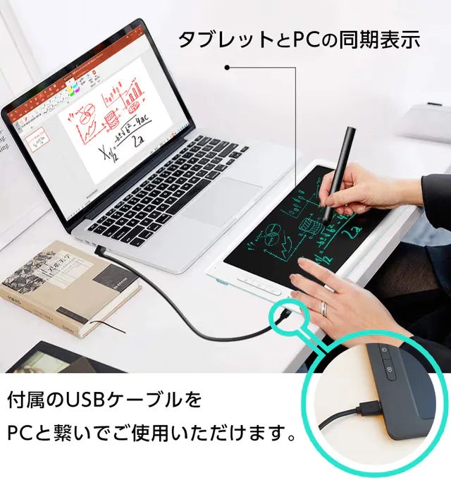 パソコンとUSB接続するだけで「手書き対応ソフト」に専用ペンで自由自在に書き込む事ができます。