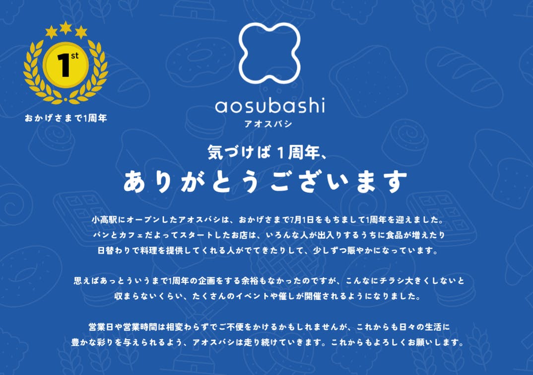 2024/07/02 12:42【一周年を迎えました】小高駅にオープンしたアオスバシは、おかげさまで7月1日をもちまして1周年を迎えました。パンとカフェだよってスタートしたお店は、いろんな人が出入りするうちに食品が増えたり、日替わりで料理を提供してくれる人がでてきたりして、少しずつ賑やかになっています。思えばあっとういうまで、1周年の企画をする余裕もなかったのですが。オープン時、A4サイズにカレンダーのクーポンだったチラシは倍の大きさのA3にサイズアップ。一面いっぱいのイベントや催しが開催されるようになりました。営業日や営業時間は相変わらずでご不便をかけるかもしれませんが、これからも日々の生活に豊かな彩りを与えられるよう、アオスバシは走り続けていきます。これからもよろしくお願いします。 もっと見るアオスバシ通信 vol.1