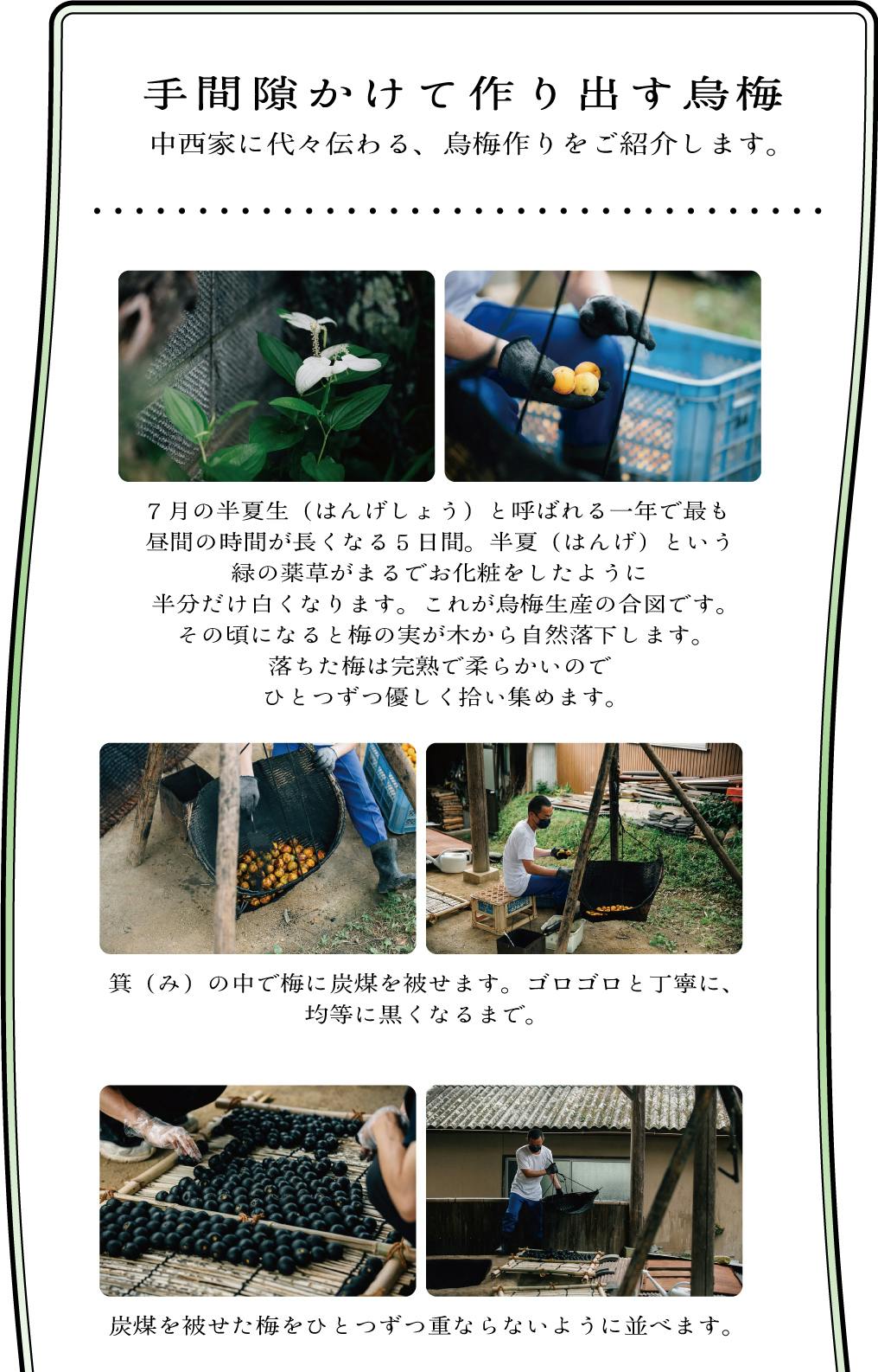 生まれてからずっと私の家には家訓のように「(天神さんをお祀りするつもりで)売れても売れなくても梅を焼け」という先祖の言葉がありました。自然とその言葉が私の真ん中にいつもあって、自動車メーカーで仕事をしている時も、いつかは梅作りに、実家に帰るんだという意識がありました。それは小さな使命感のようなものかもしれませんが、私自身が「烏梅を世の中に残したい、歴史と伝統のある烏梅だからこそ何か面白いことができるのではないか」と明るい可能性を信じていたように思います。