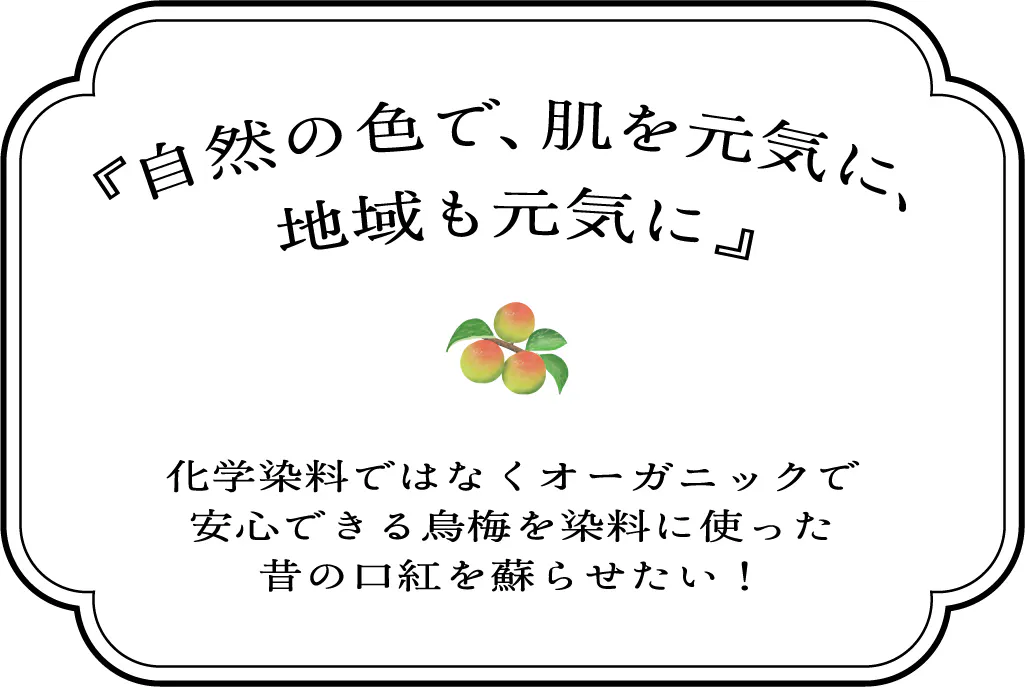 紅花と烏梅の口紅は当時から伝統工芸品として大切にされてきました。これまで先人たちの強い想いで守ってきた烏梅作りを後世に残すため、伝統と文化の継承のためにも紅花と烏梅だけを使ったオーガニックの口紅を復活させたいです!